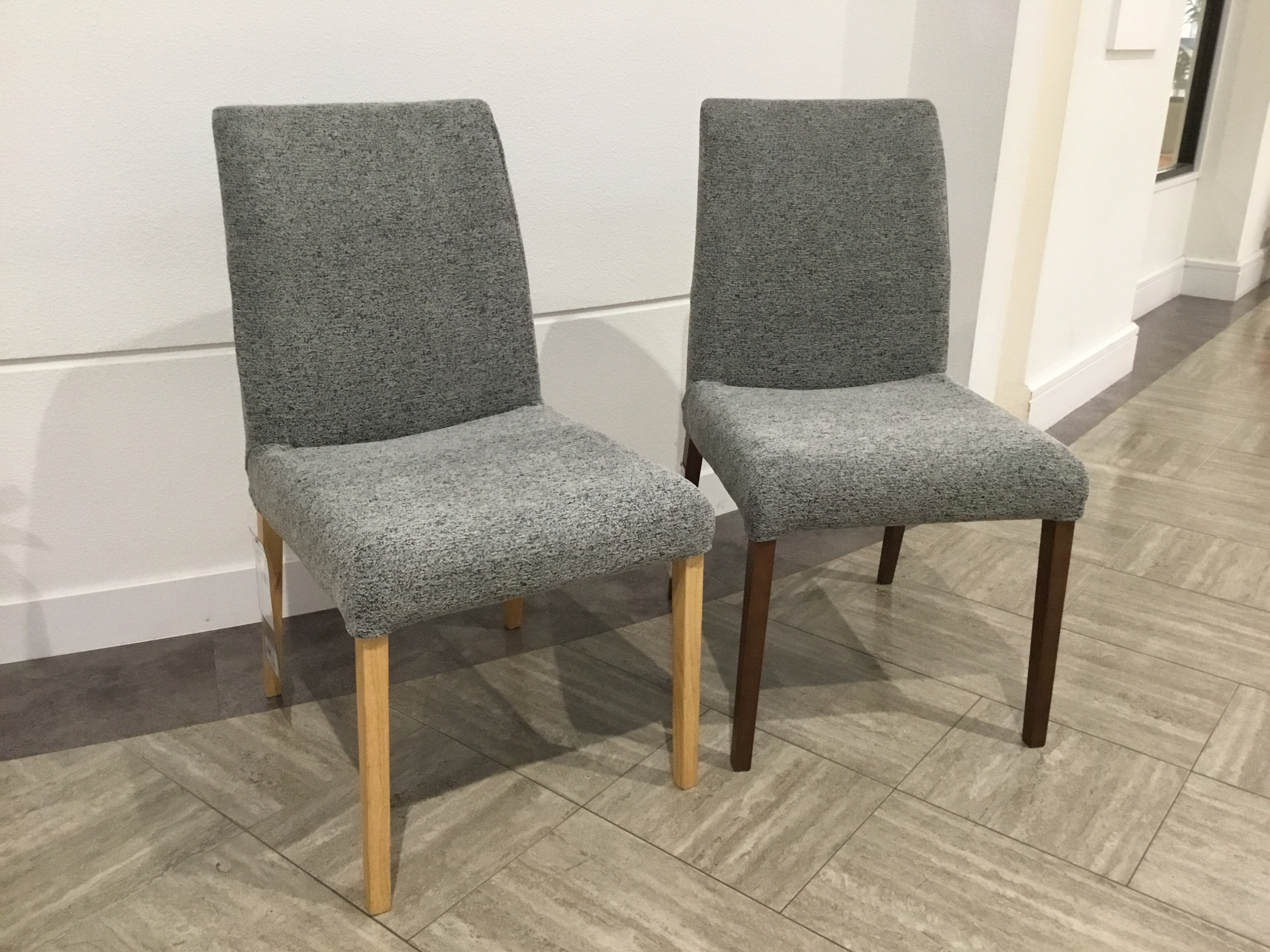 (右)シンプルなデザインのチェア。背もたれにウォールナットの無垢材を使用しています。チェアカバーセットです。