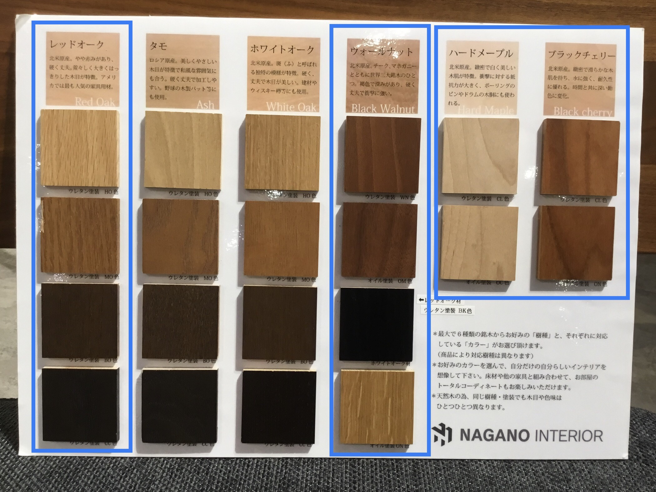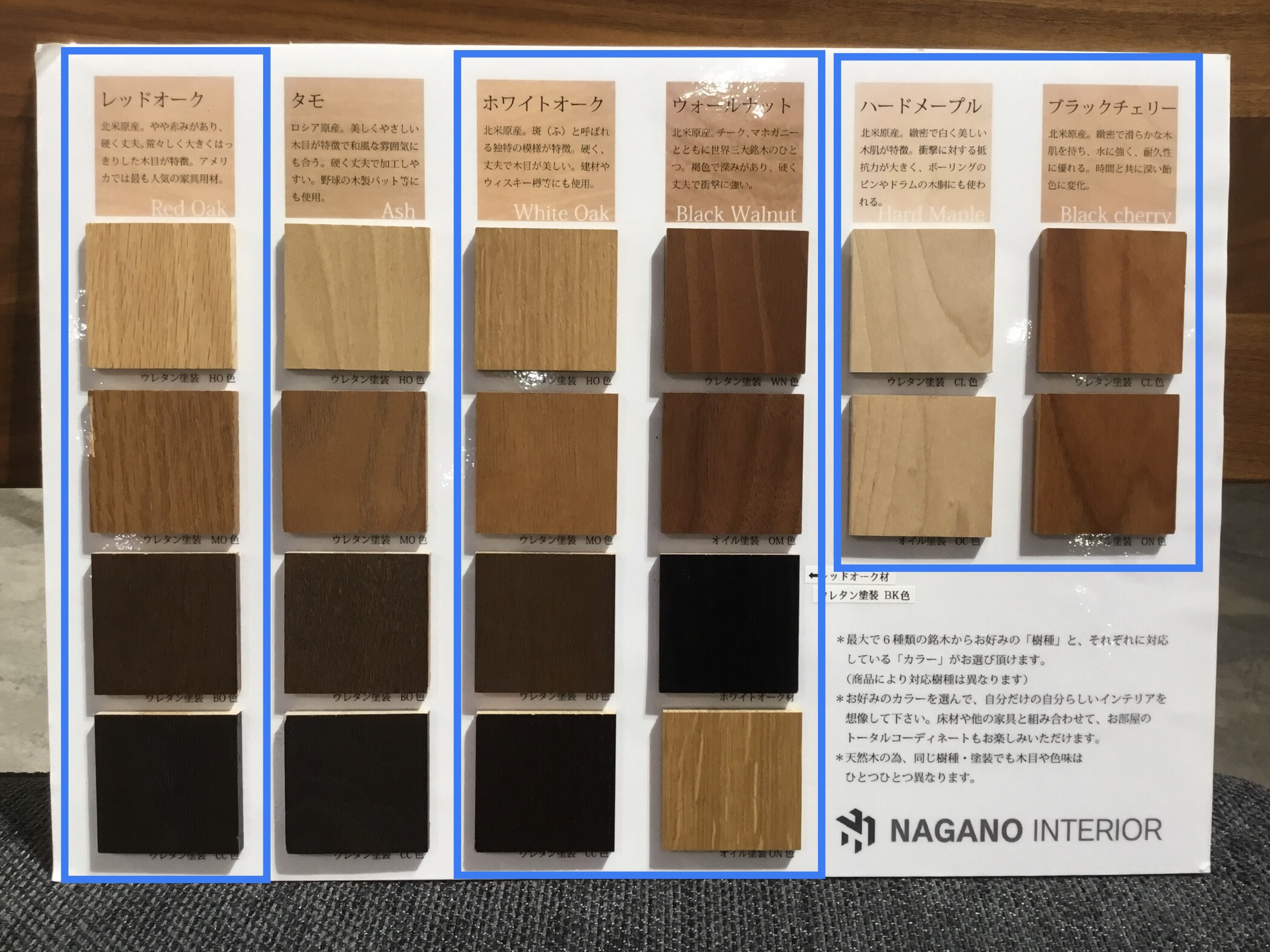 材種はレッドオーク、ブラックチェリー、ハードメープル、ウォールナットより選べます。