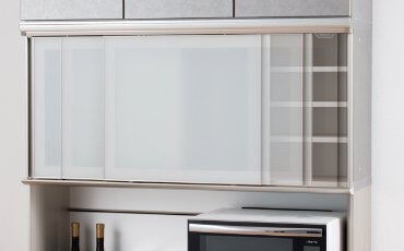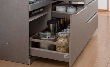 引き戸はゆっくりしまるデュアルソフトクローズでお皿も取り出しやすいフルオープン仕様。