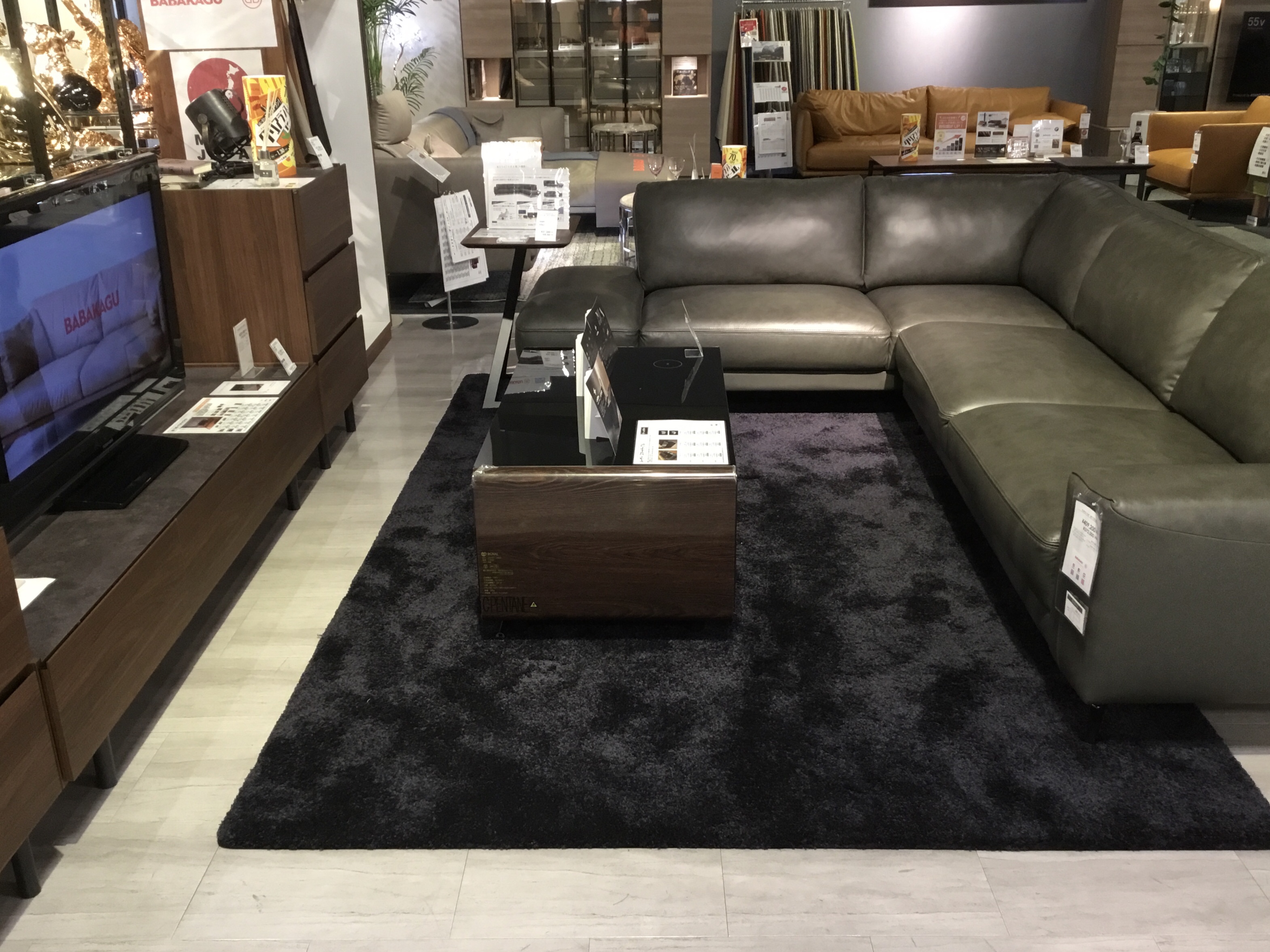 展示もブラック脚のソファと合わせてコーディネートしております!