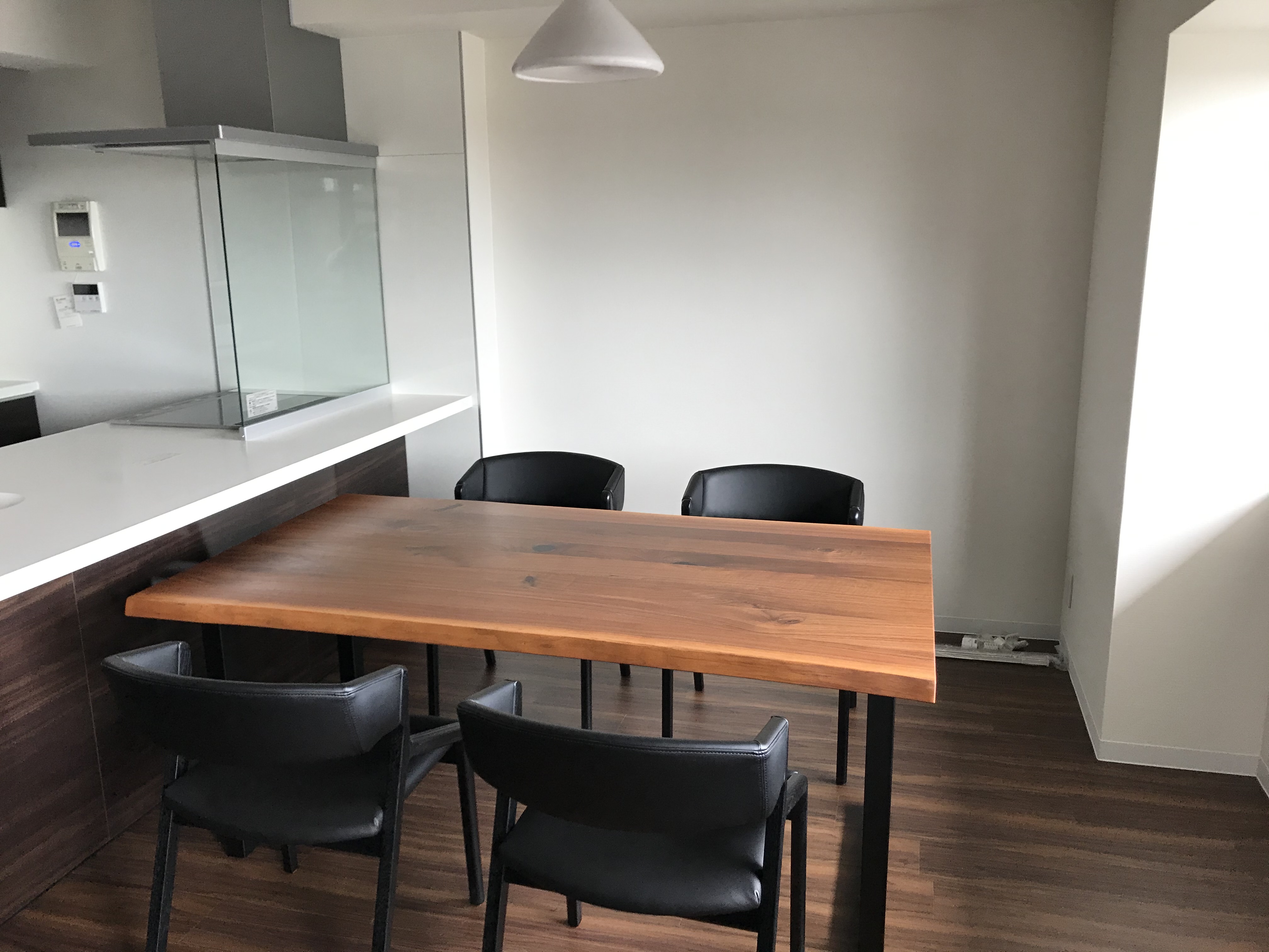 ダイニングテーブルは、無垢天板にブラックの脚の組み合わせ。