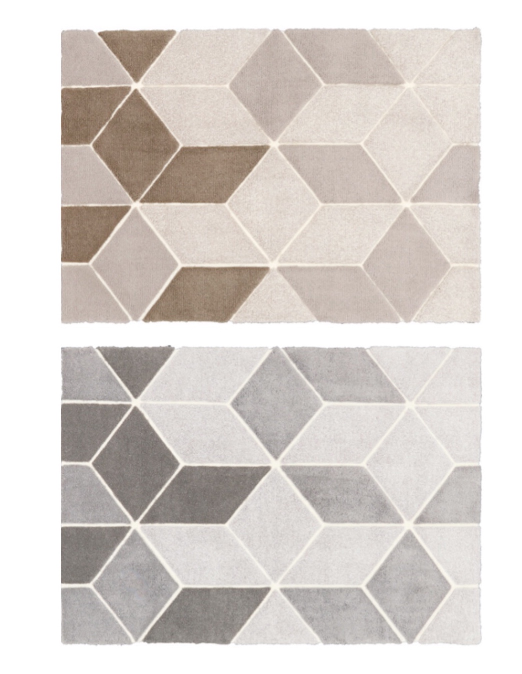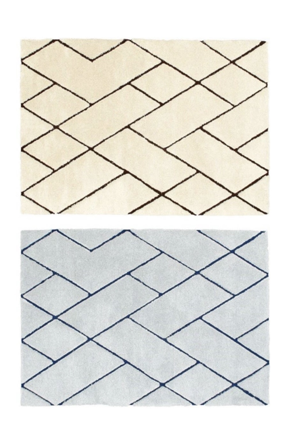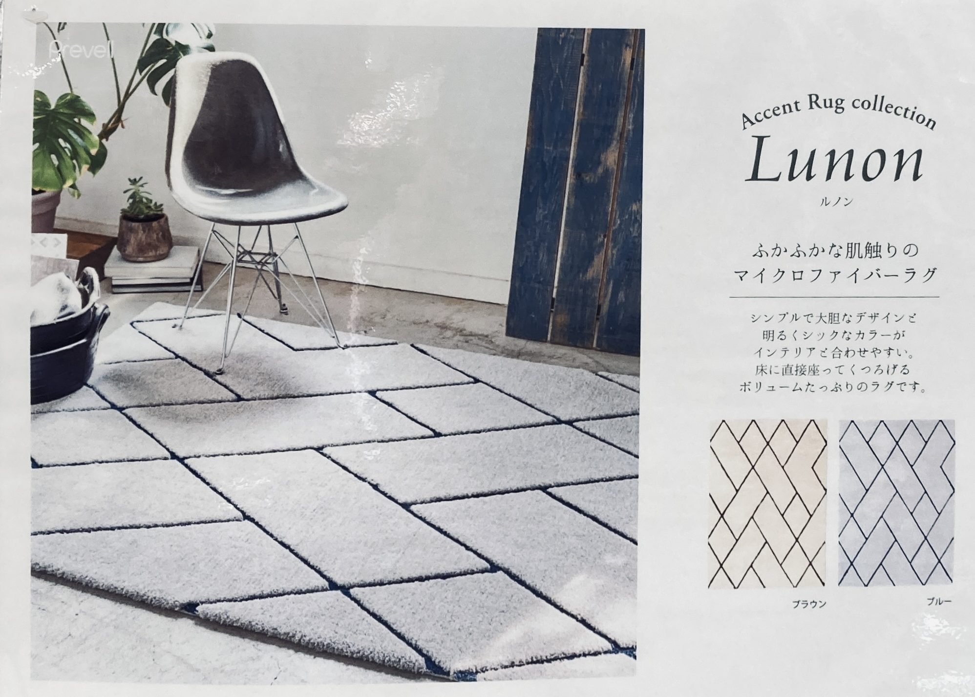 幾何学模様の大胆なデザインをマイクロファイバーの柔らかな風合いで落ち着きのあるカラーでインテリアに取り入れやすいアクセントラグ(画像手前)