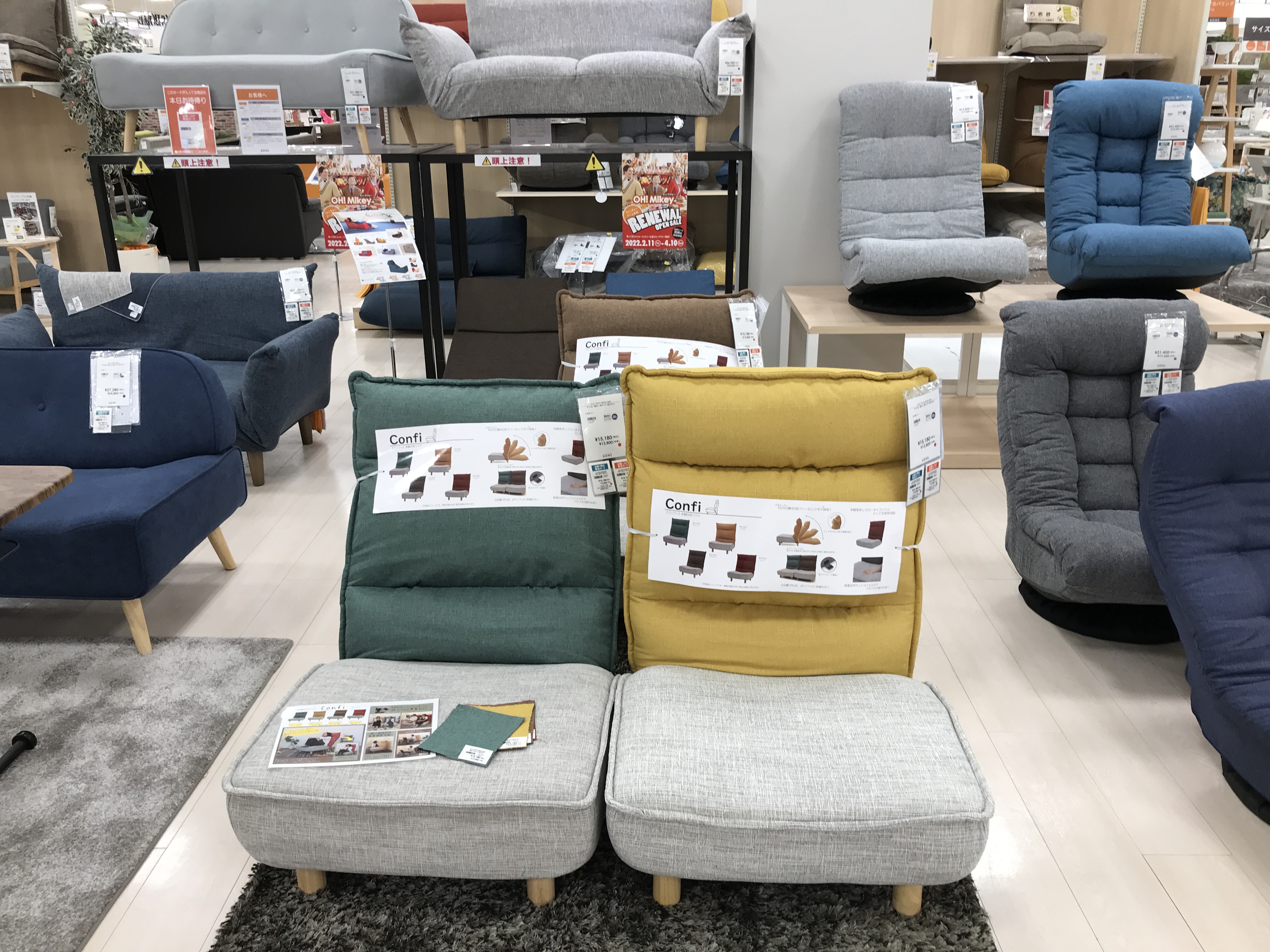 店頭にて座り心地やソファのボリューム感を