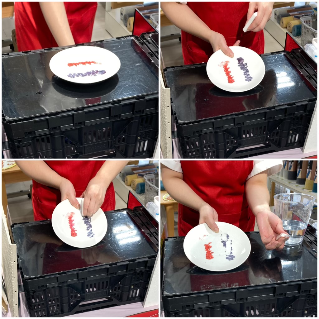 油性ペンでお皿に汚れをみたててスーッとゴムポンで汚れが落ちるのにはびっくり!