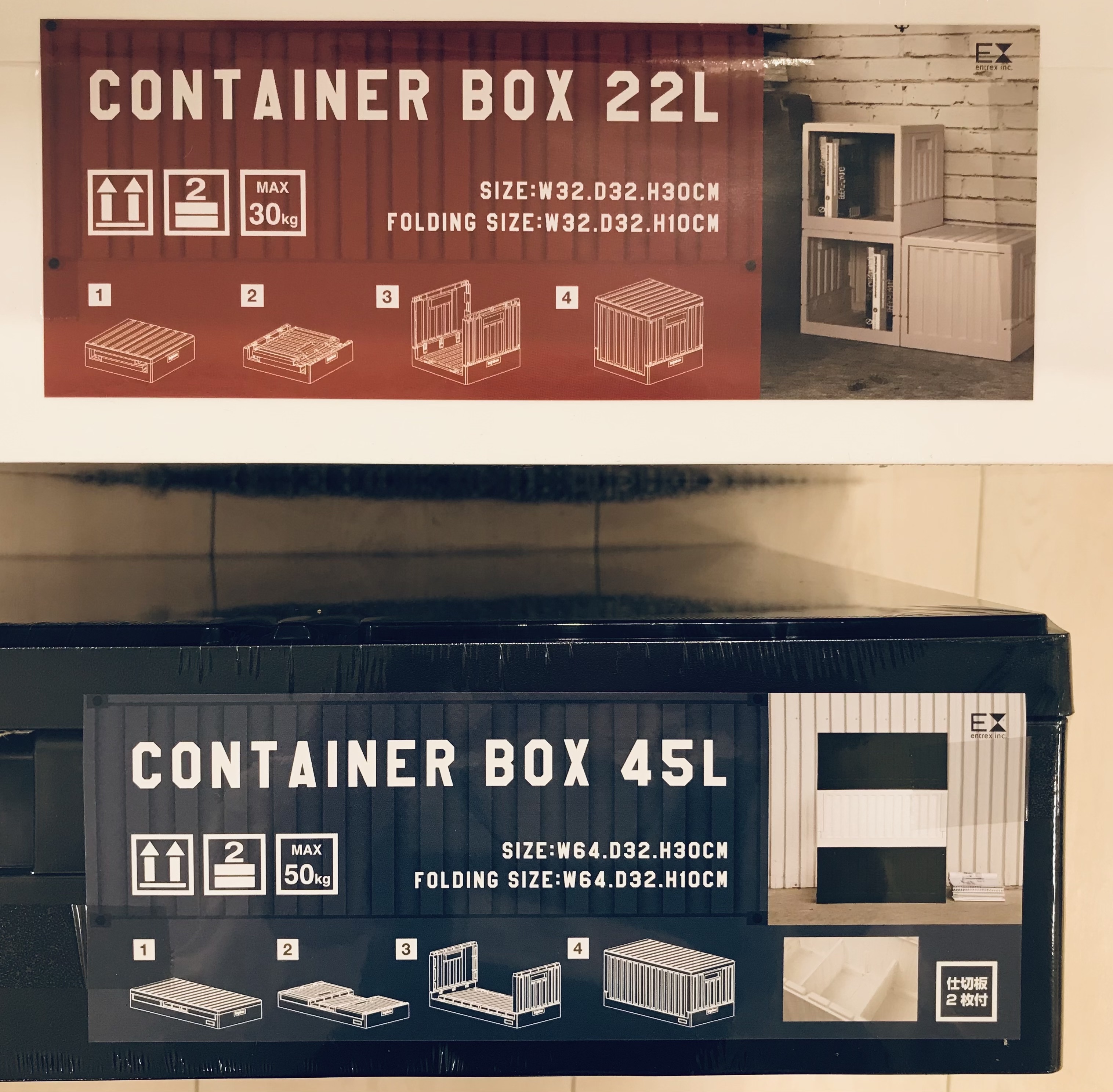 45L(耐荷重50kg)・22L(耐荷重30Kg)のサイズは2種類