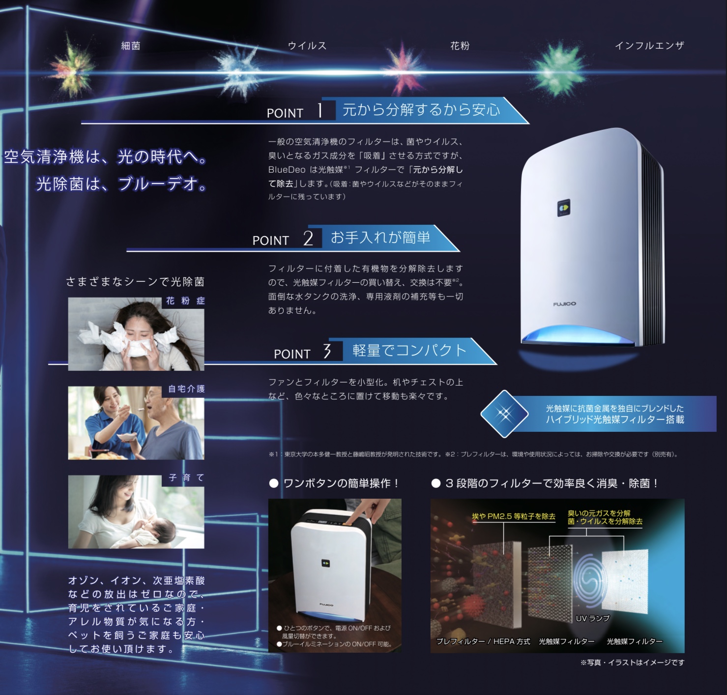 ブルーデオは光触媒フィルターで菌やウィルスを「光の力で元から分解して除去」してくれます。