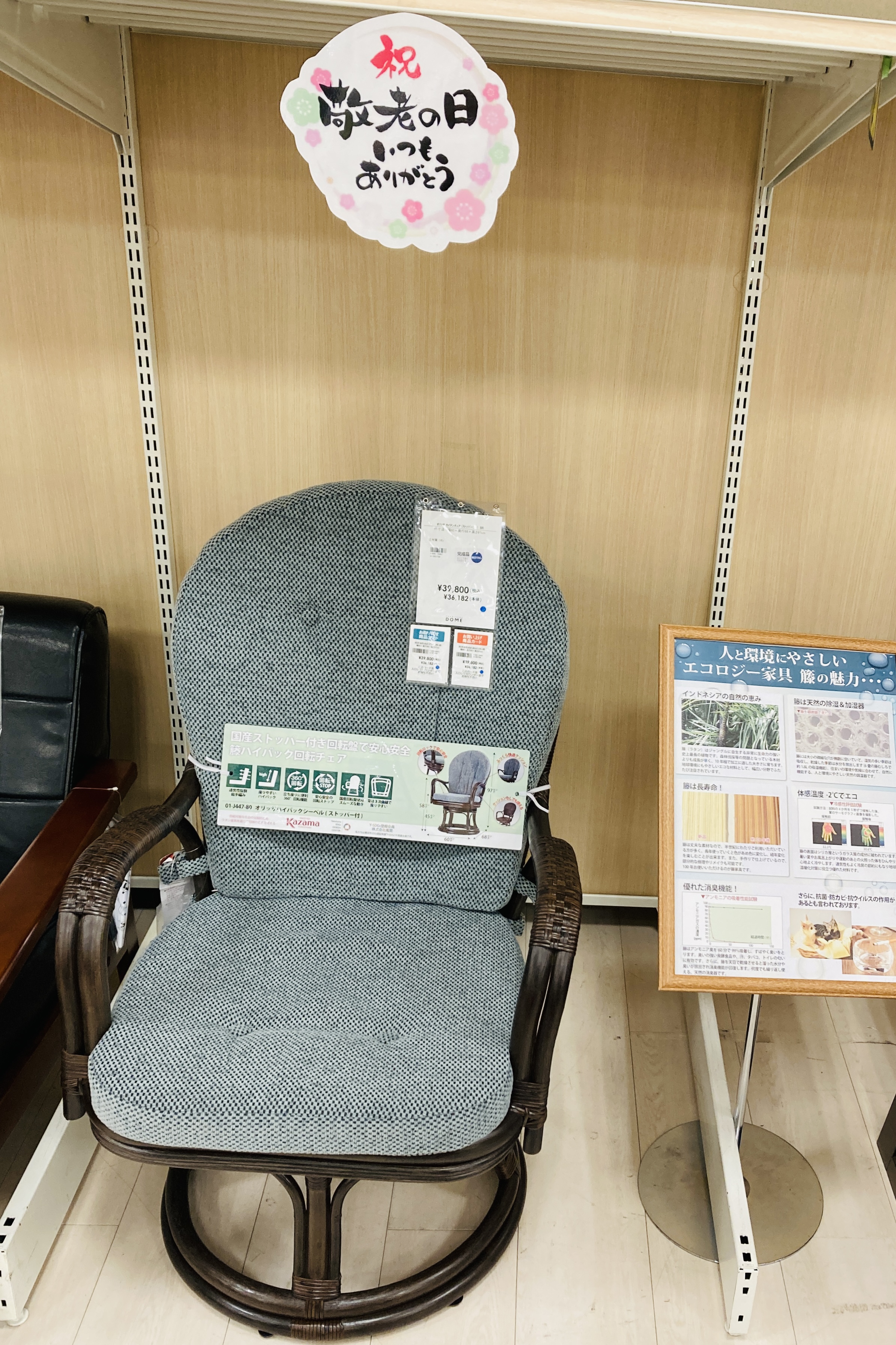 環境に優しい藤素材の回転チェア。肘掛付きなので楽に立ち上がれます。