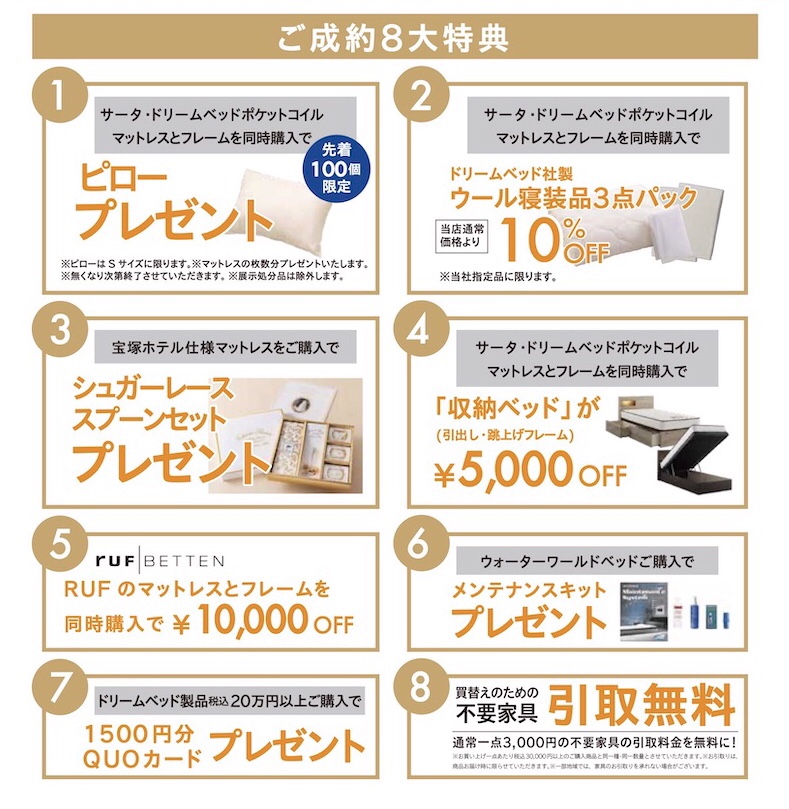 サータまたはドリームベッドのフレームとポケットコイルマットレスをご購入でプレゼント特典をご用意しております!また、その他にも当社指定の商品や条件はございますが、特典をご用意しております!