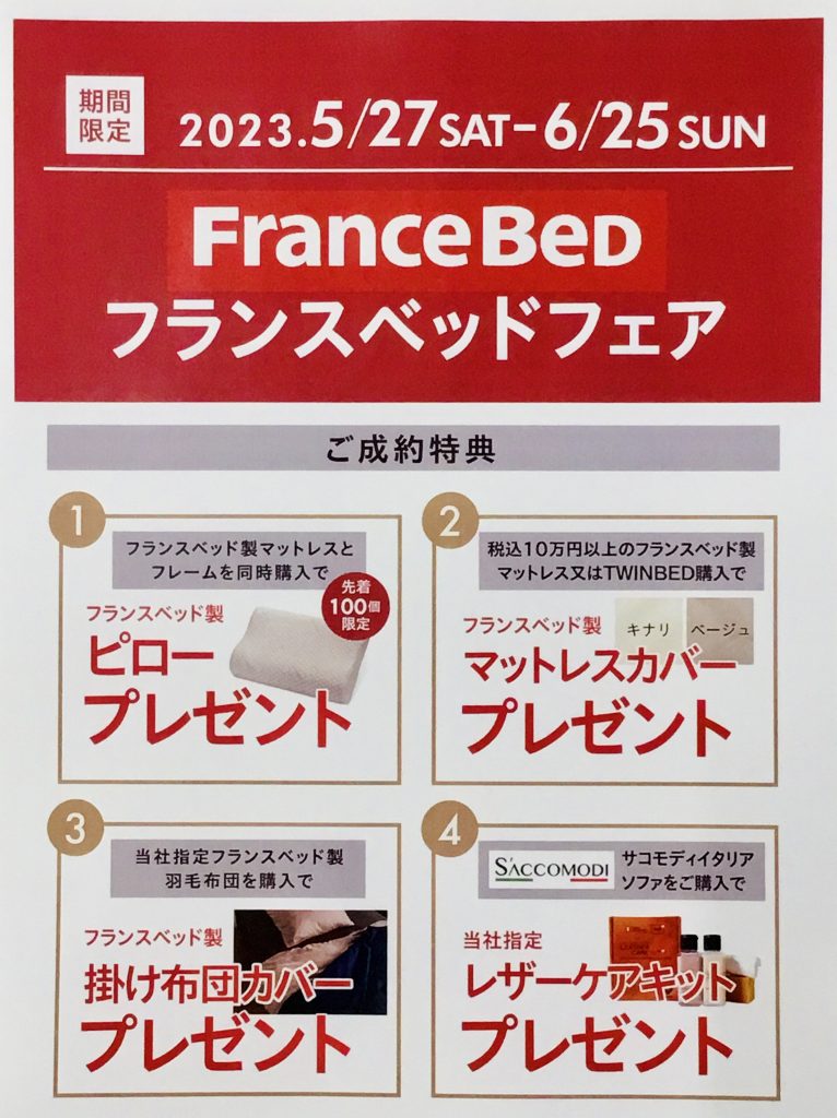 5月27日から開催している『フランスベッドフェア』も残すところ、10日間となりました!