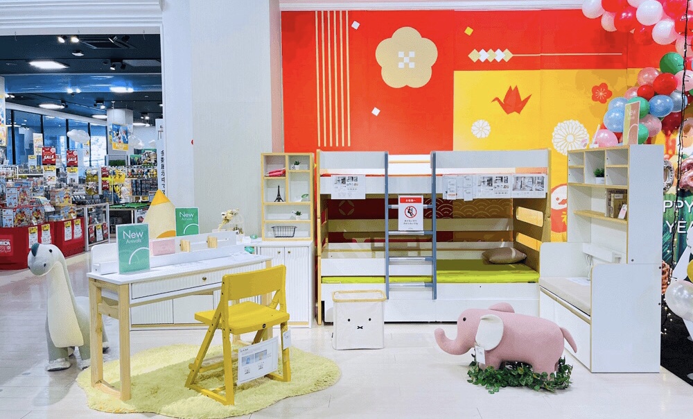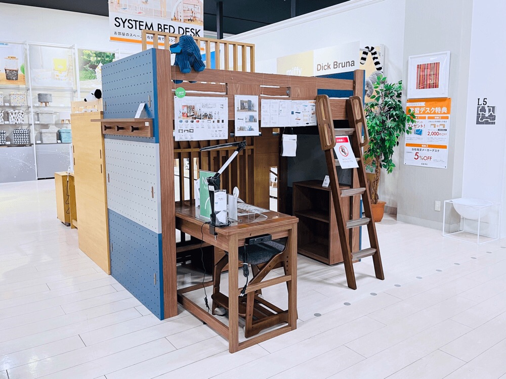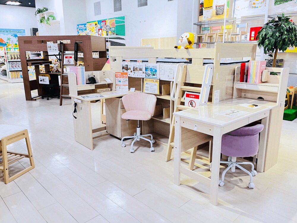 2階デスク売場は、カラーデスクやロフトベッド、システムベッドなど、お子様がワクワクするようなポップな商品を集めた売場になっています。