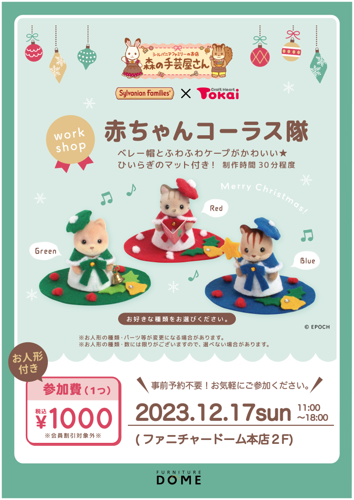 12月17日(日)ファニチャードーム本店2階にて、シルバニアファミリーの可愛いお洋服を作るワークショップを開催します!