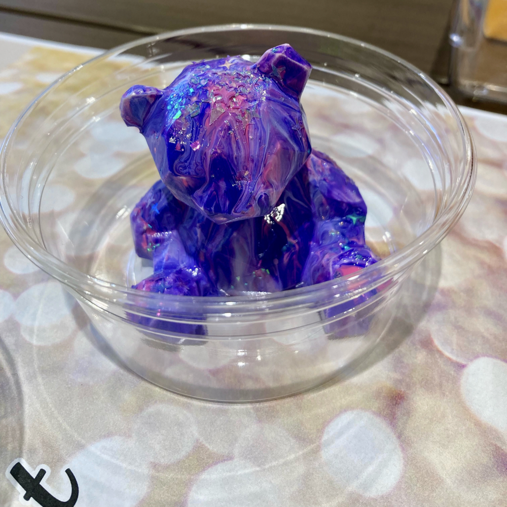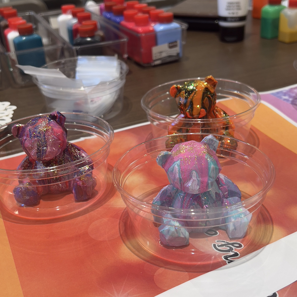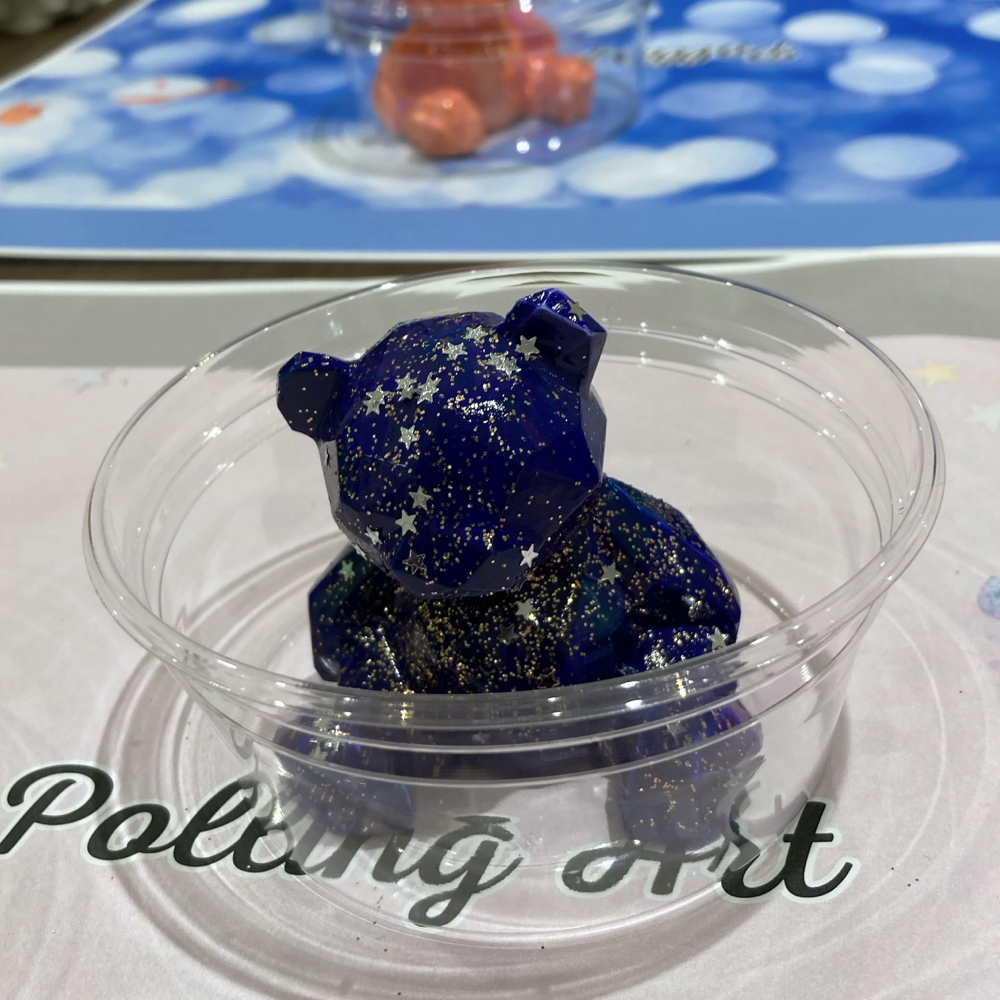 コンクリートでできたクマのフィギュアに、絵の具を垂らしてオリジナルベアを作ります。最後にラメを振りかけて、華やかで可愛らしいクマちゃんに!