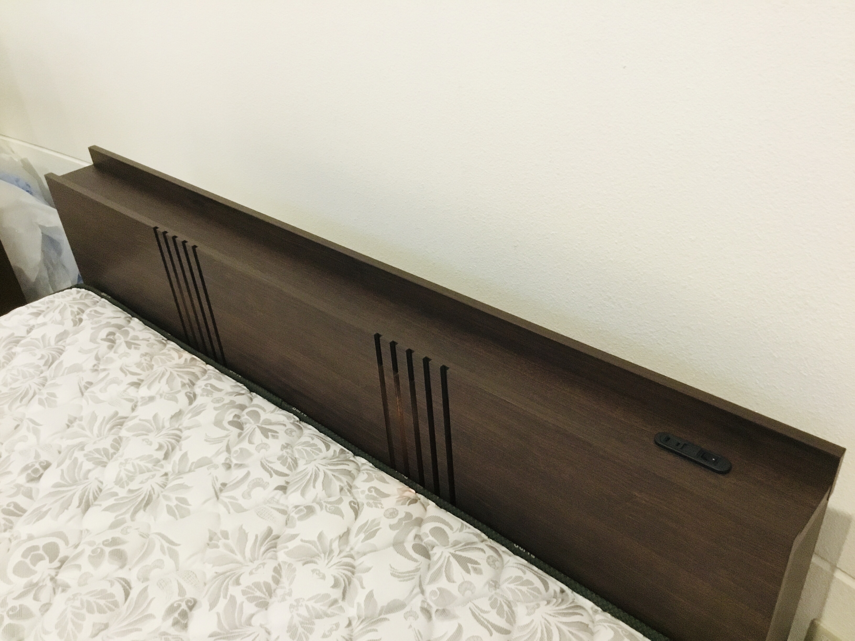 ヘッドボードは照明とコンセント1つ付きで、ものが置けて便利なキャビネットタイプです。