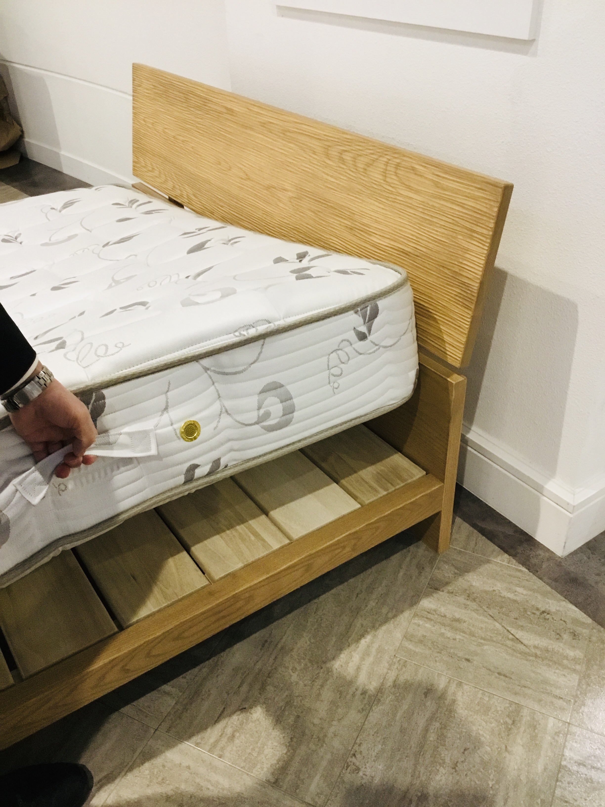 タモ無垢材を贅沢に使用し、厚みのある幅広のスノコを使用したフレームに、固めのマットレスを合わせたベッドです。マットレスのサイドには持ち手もついているので、メンテナンス時のローテーションで持ち上げるのに便利です!