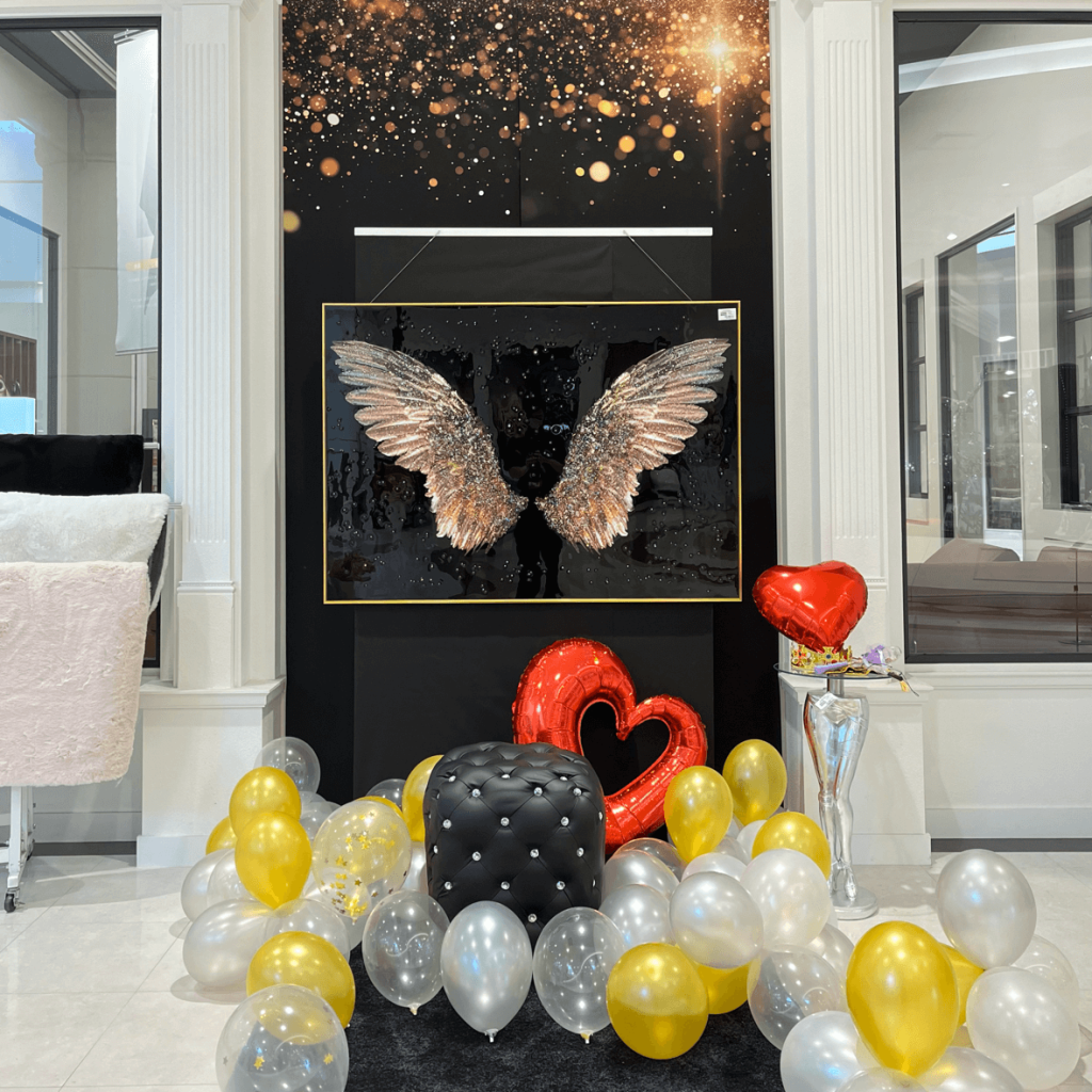 羽をモチーフにしたクリスタルアートパネルの前でぜひ撮影してください。