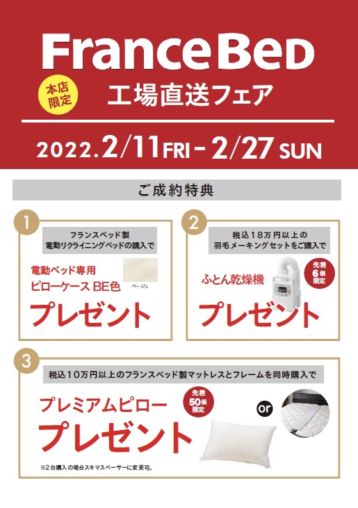本日、2月11日(金)より2月27日(日)まで、『フランスベッド工場直送フェア』開催となります。