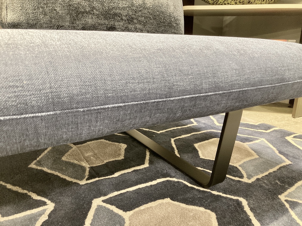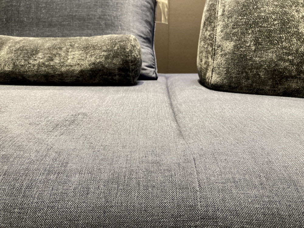 展示商品の張地は、光沢のある上品なブルーのファブリック。
