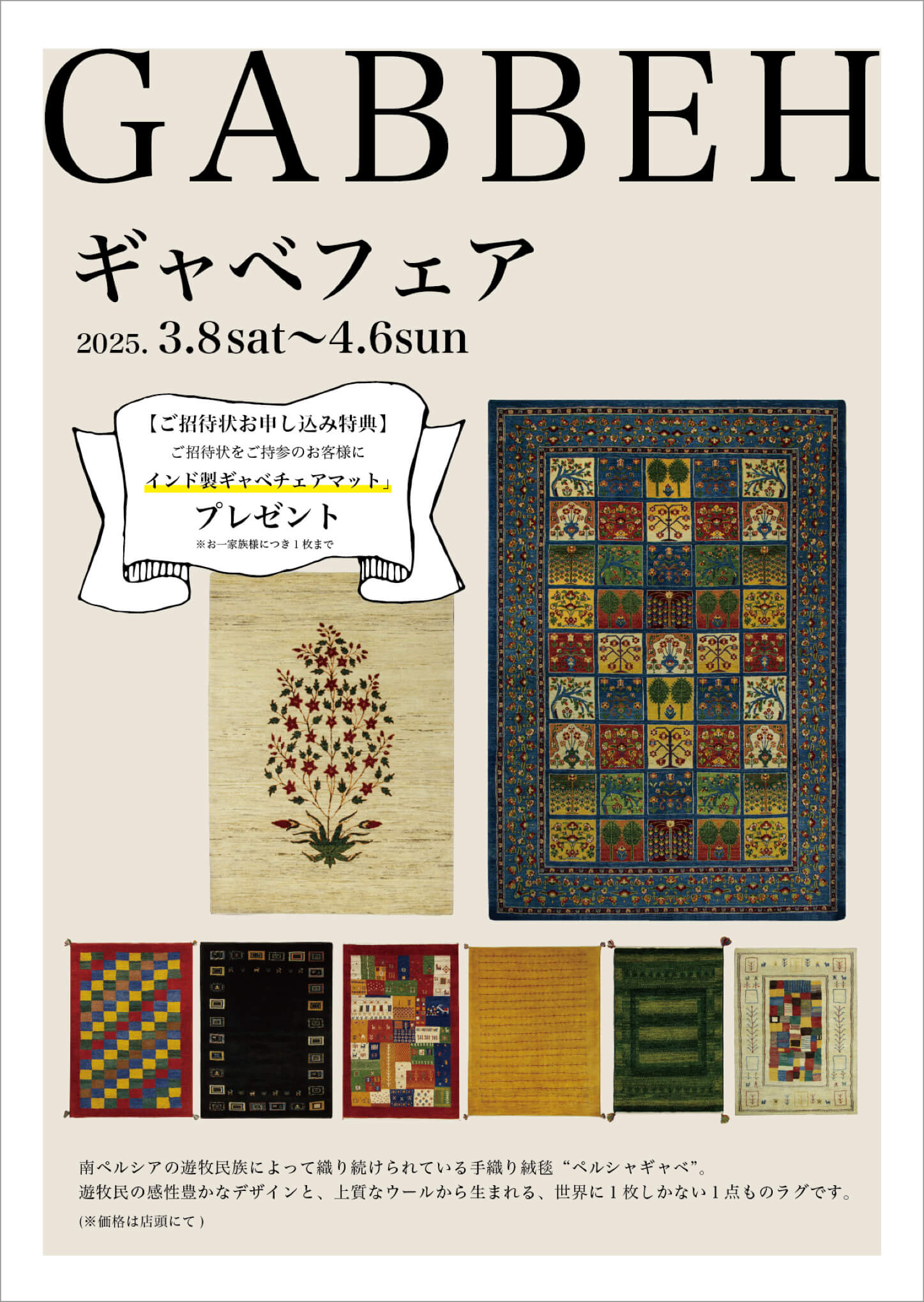 ご招待状お申し込みの方には、事前にこの期間に入荷するギャベや特価ギャベが掲載されたリーフレットを郵送させていただきます。ご来店特典もございますので、気になった方は是非お気軽にお申し込みくださいませ