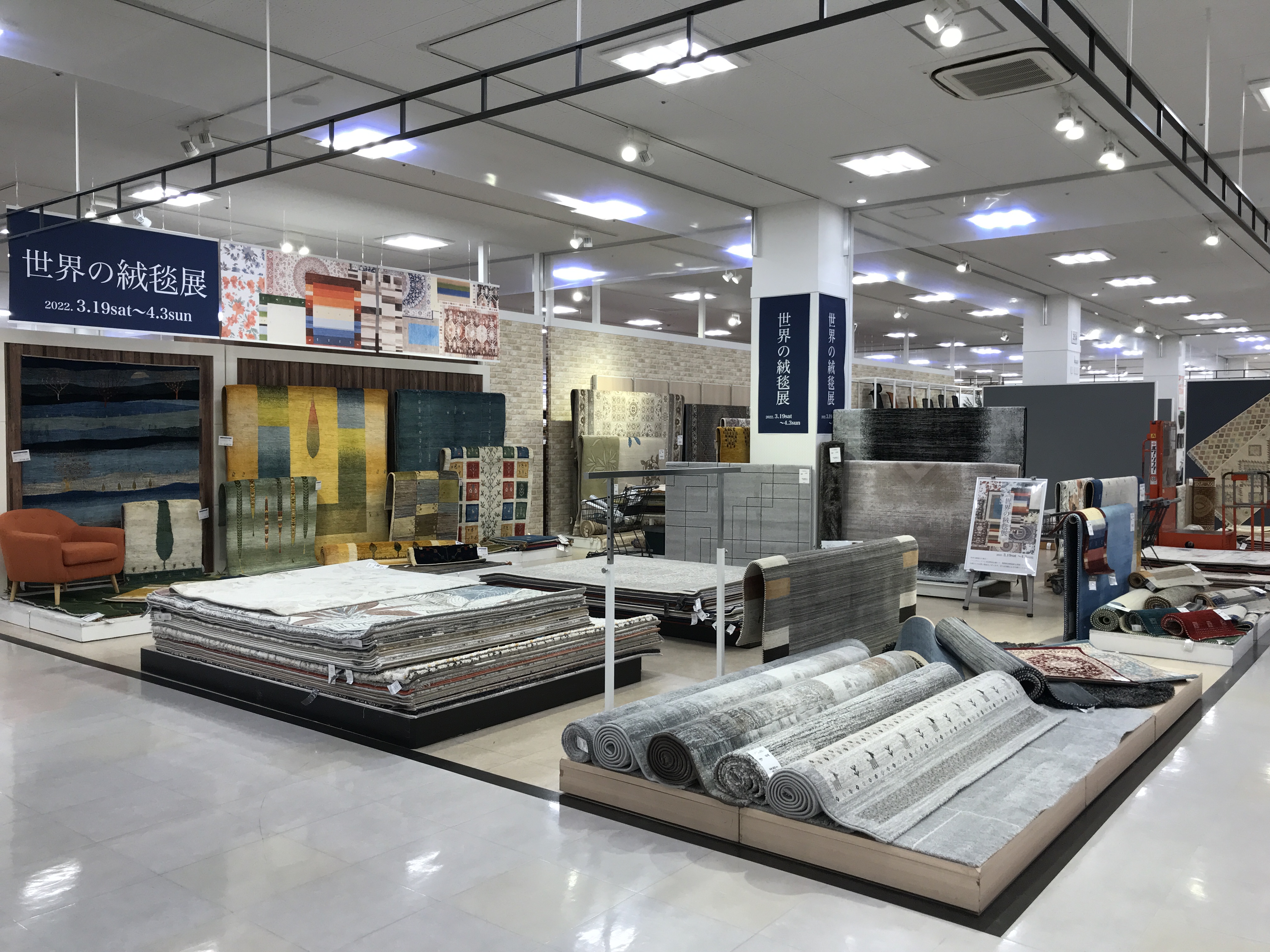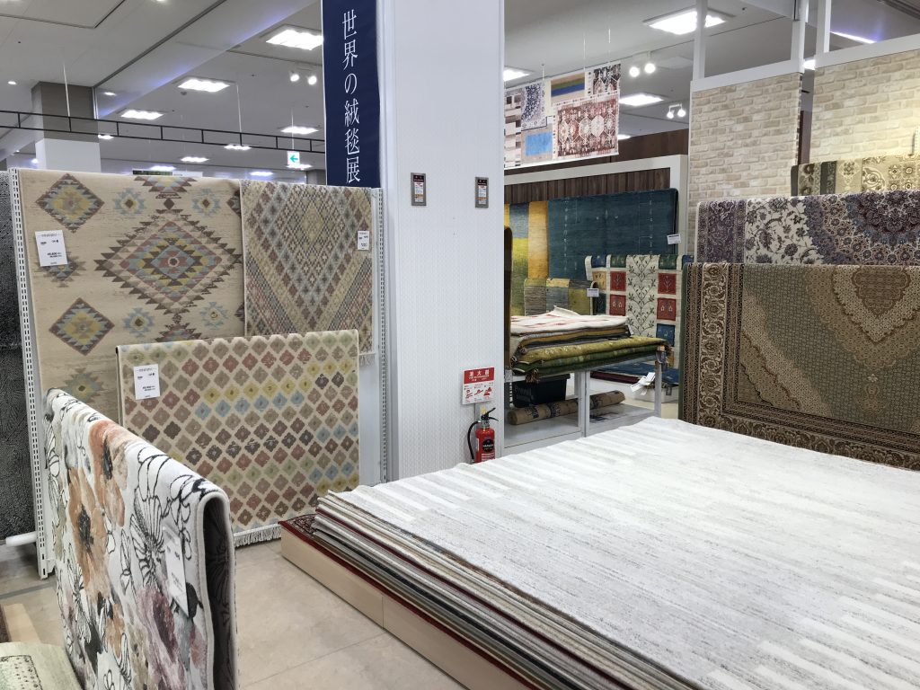 3月19日(土)からの「世界の絨毯展」売場準備中・・