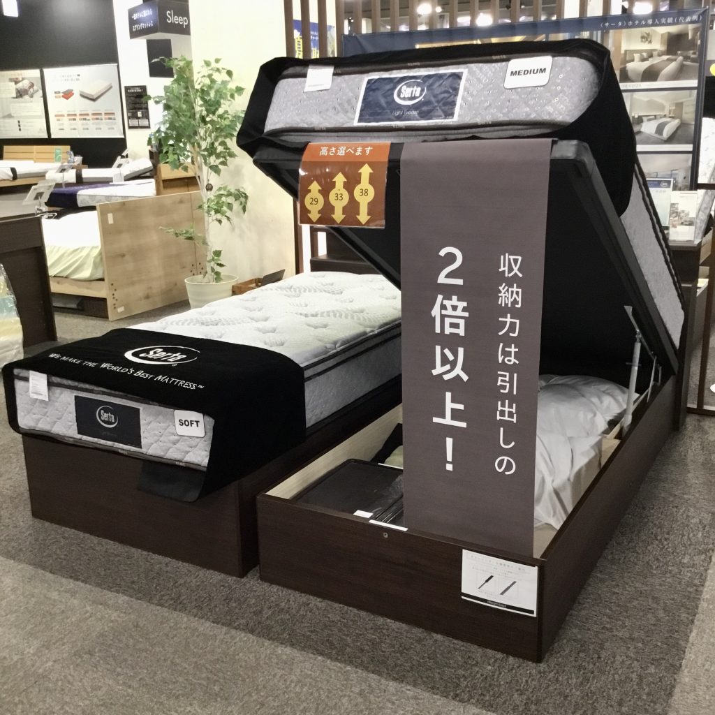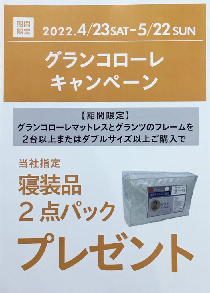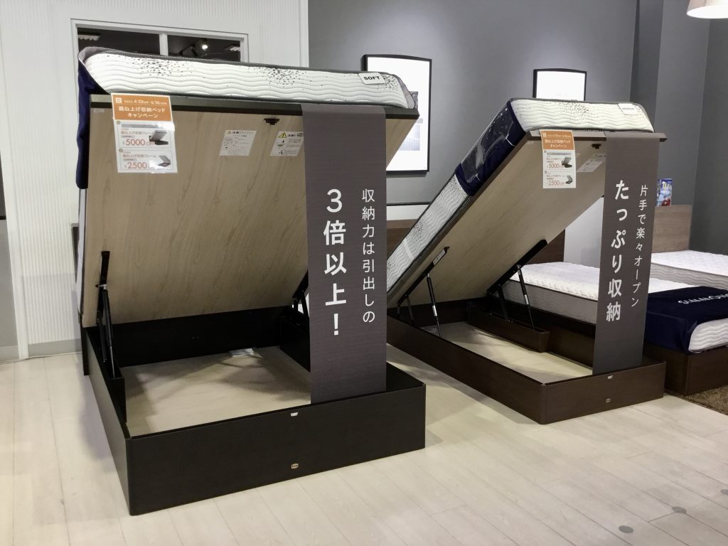 4月23日(土)から始まったベッド売場のキャンペーンの中から、今日は「跳ね上げ収納ベッド」と「グランコローレ」のキャンペーンをご紹介致します。