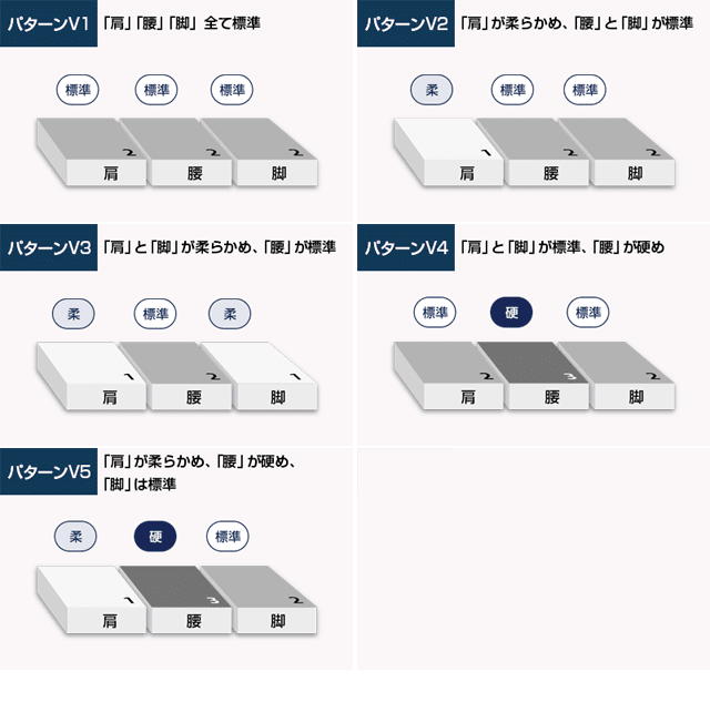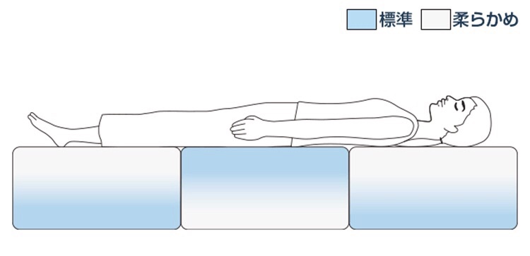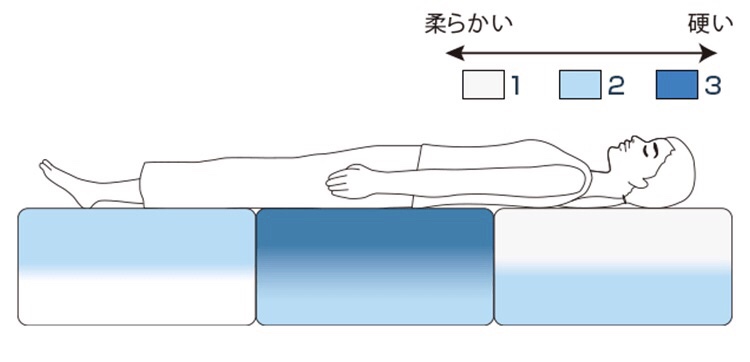 ひとりひとり体形・体格は違うため、寝ているときの身体への負担も部位ごとに異なってきます。体形・体格に合わせて肩・腰・脚の硬さを変えることで、支える力が変わり、より身体への負担を軽減し、理想的な寝姿勢を実現します。
