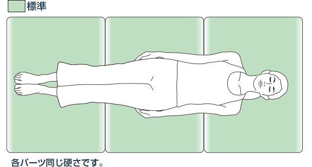 個別仕様化可能な高機能マットレスで、表裏で硬さが異なり、標準、硬め、柔らかめの3段階の硬さを持つ3パーツからできています。組み替えることで体形・体格に最適な硬さパターンに変えることができます。