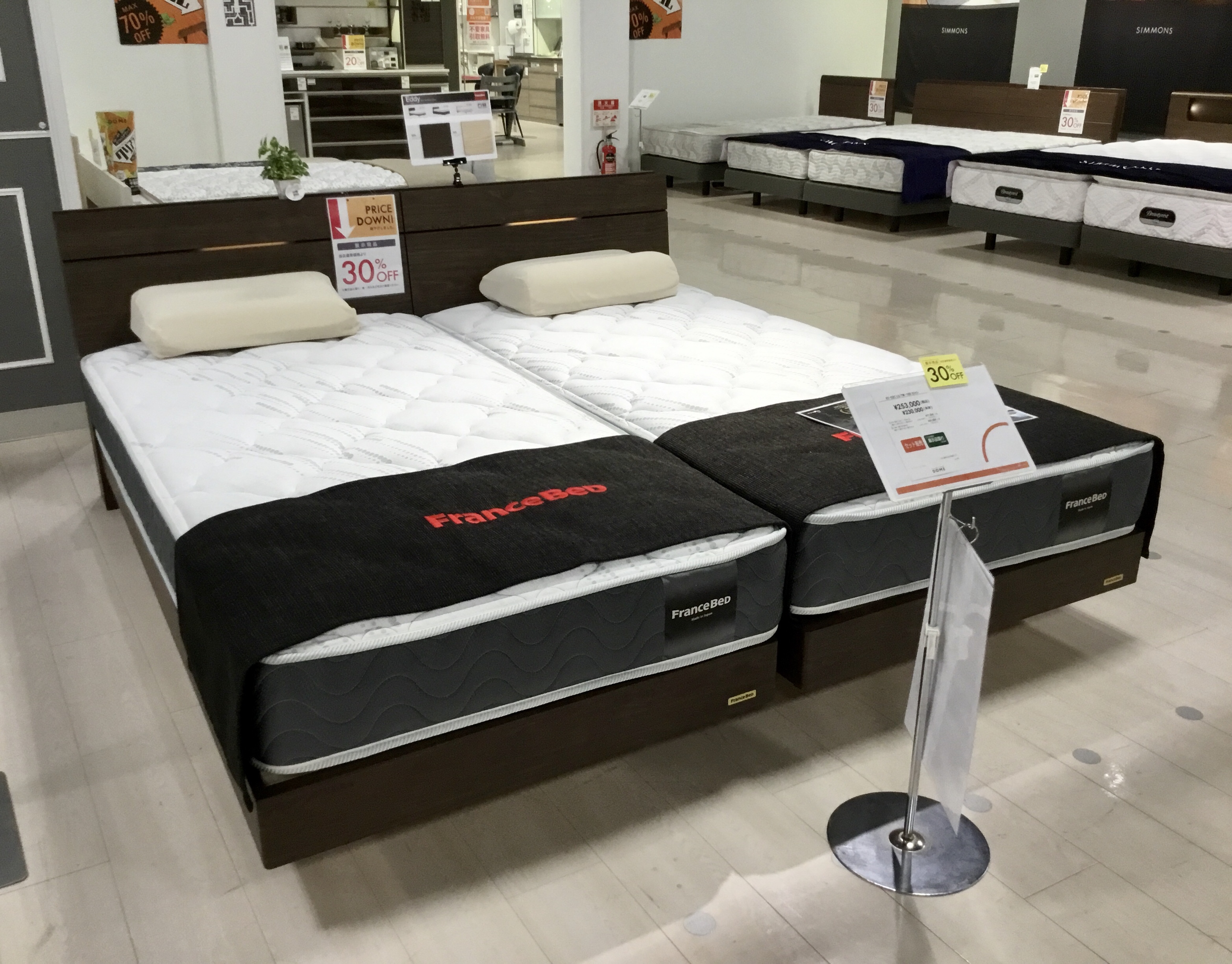 ⬇︎その更に左側に、シモンズベッドのツインコレクションが3セット。