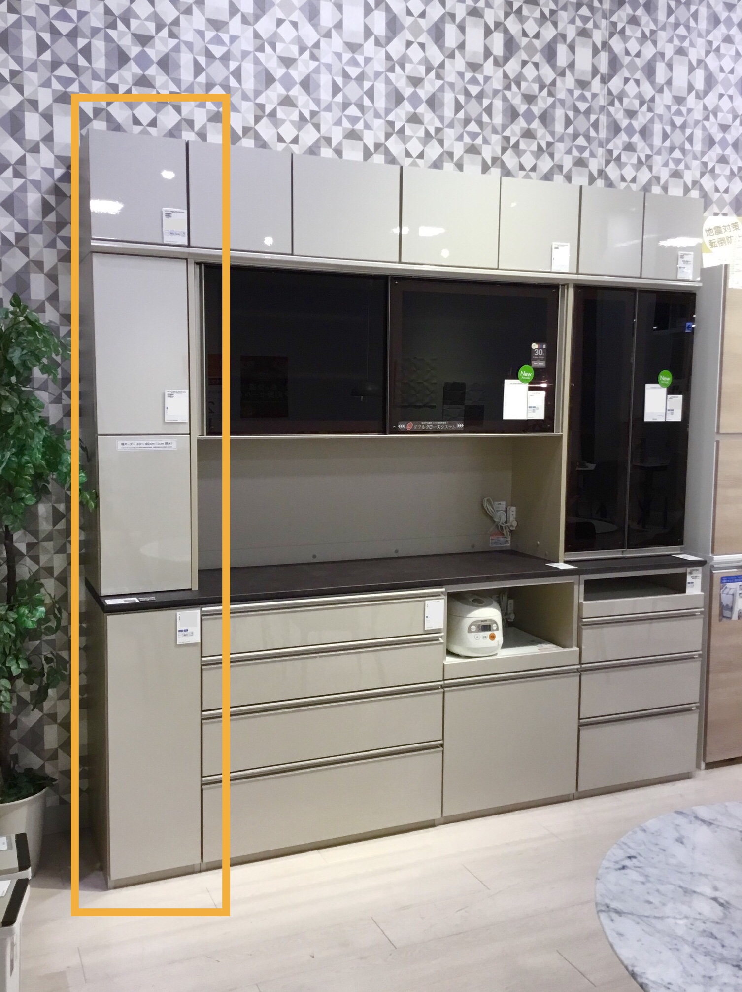 指定のユニットボックスを20cmから40cmで1cm刻みにして合わせることで食器棚の横のデッドスペースを収納場所として有効活用いただけます。