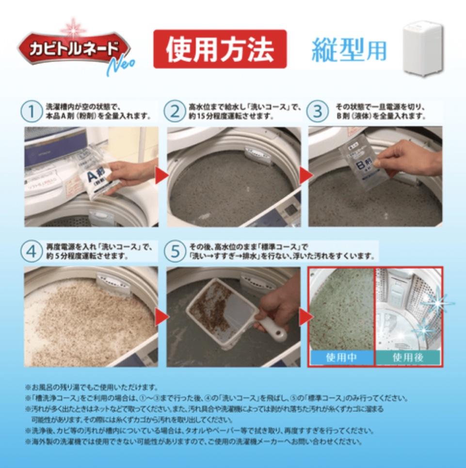 Aの粉末剤を先に入れてBの液体を後入て約20分程度の洗浄とすすぎのみなので時短にもなります。