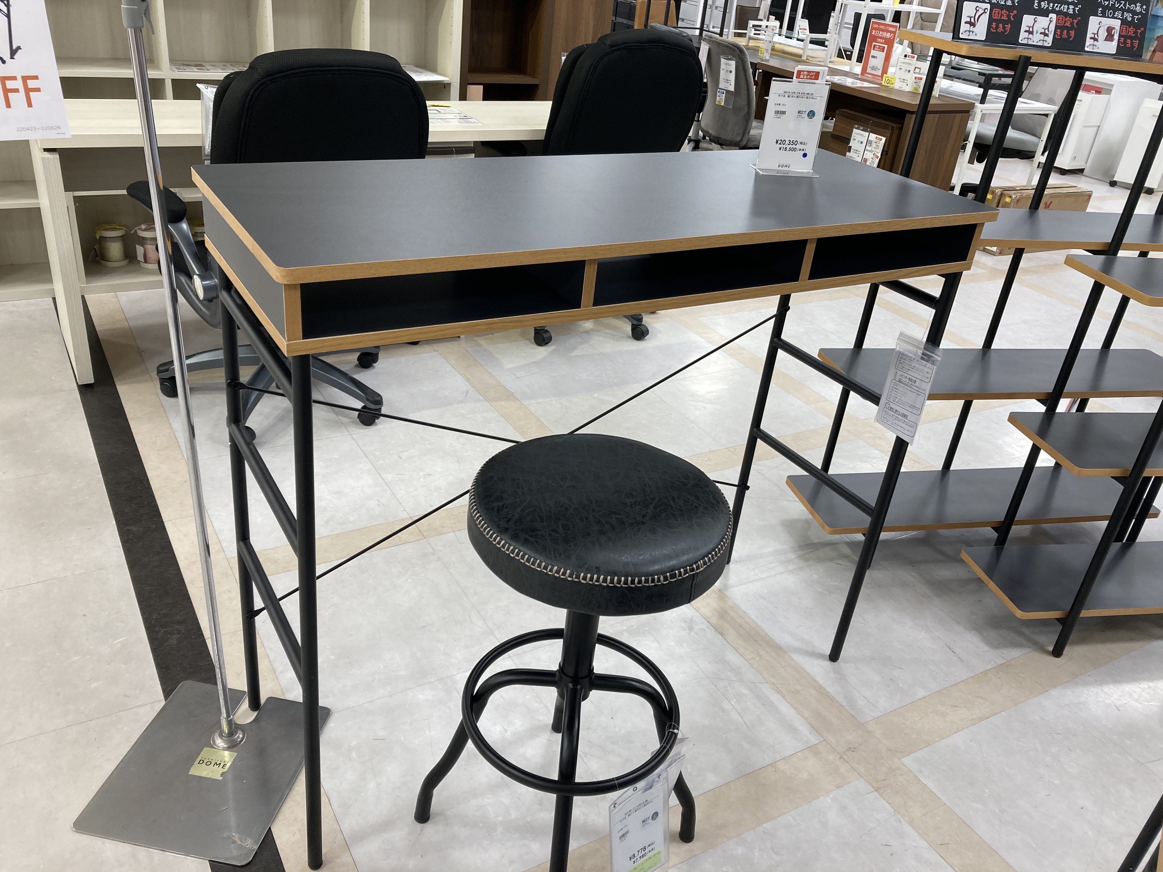 デスクとハイテーブル・ラックを同シリーズで組合わせて統一感のある空間に