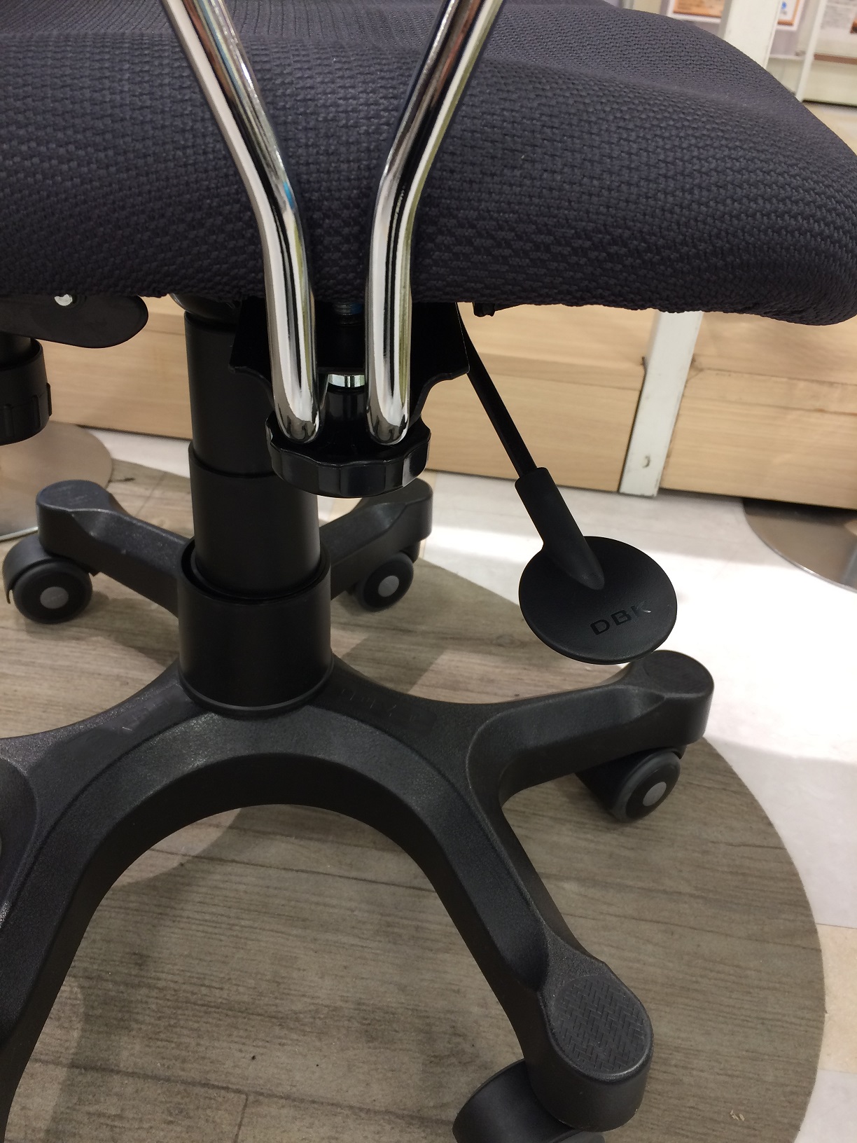 座面したのレバーで座面の昇降、奥行きを調整