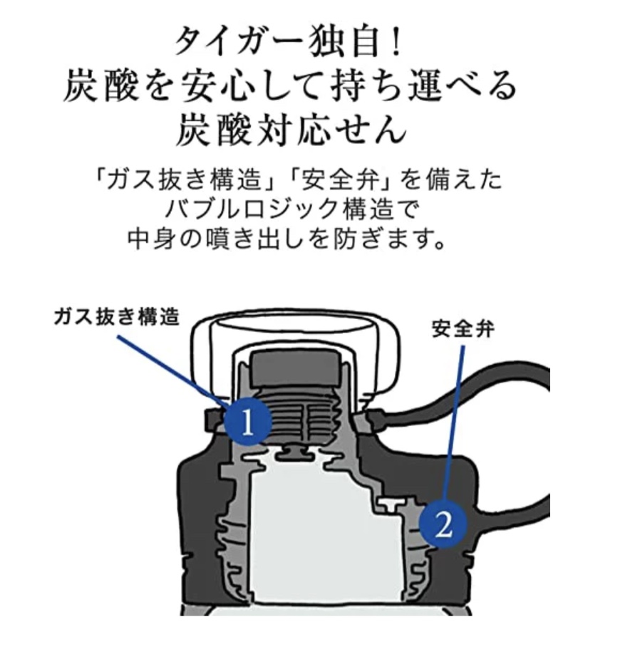 炭酸ガスの噴き出しを防ぎ開けやすい「ガス抜き機構」と内圧の高まりに対応する「安全弁」を備えたタイガー独自のBubble Logic(バブルロジック)を採用。