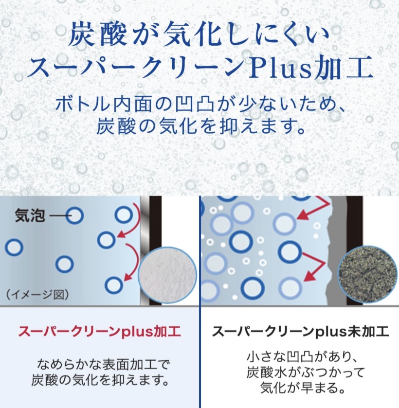 スーパークリーンプラス加工でボトル内面の凹凸が少なく、炭酸の気化を抑え、 汚れやニオイがつきにくい ボトル内面や安心して使える抗菌加工せんキャップでより安心・安全なボトルです。