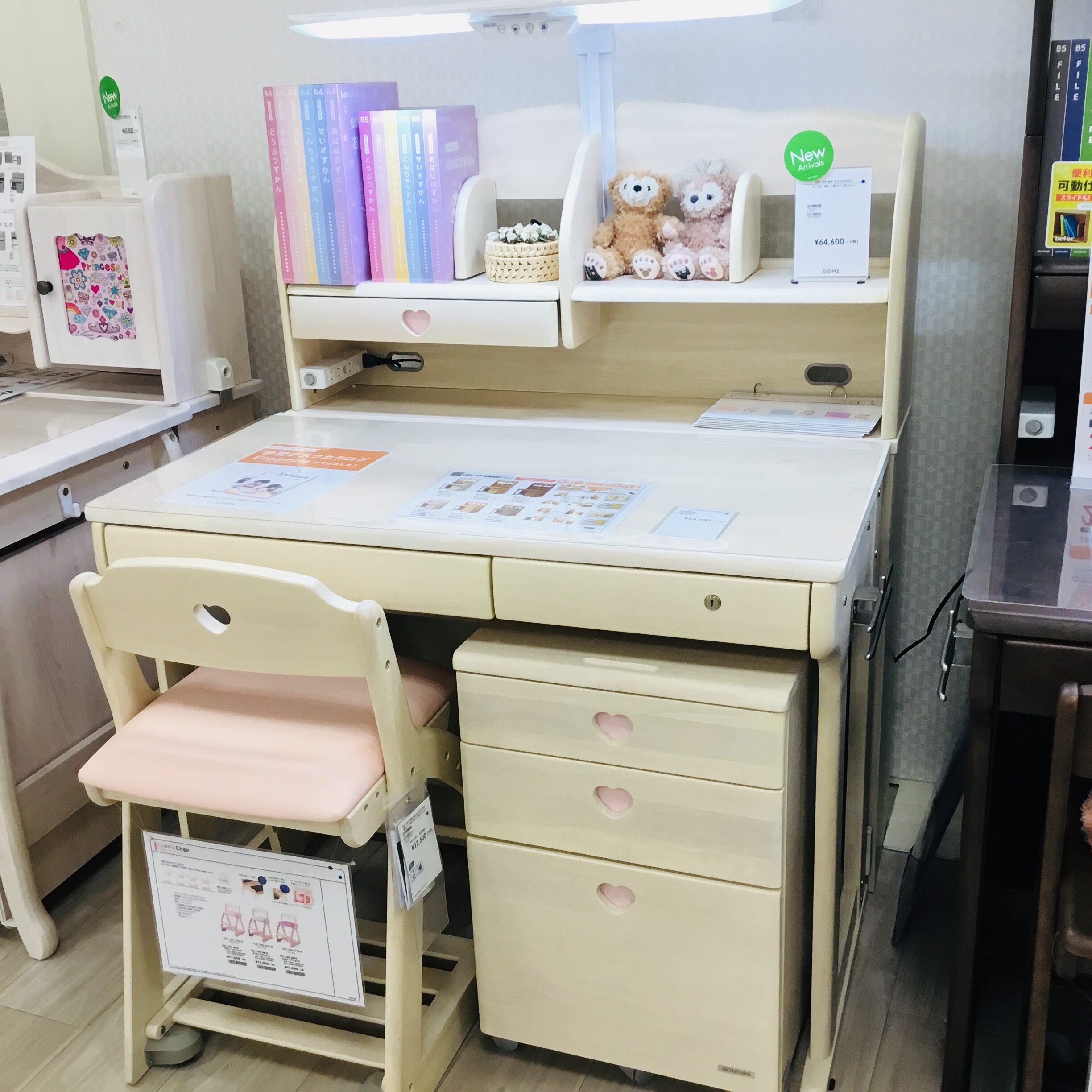 ホワイトの木目にポイントでピンクをあしらい、丸みのある輪郭で可愛らしいシンプルな組み替えのデスクです。引き出しのピンクのハートは、回りと同じホワイトの木目にも変えられます。