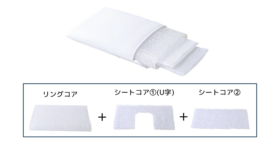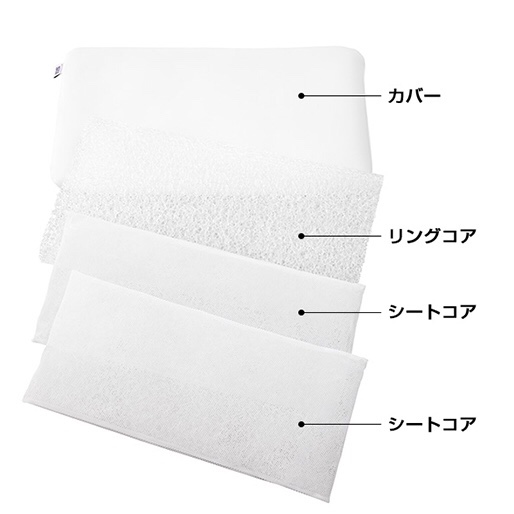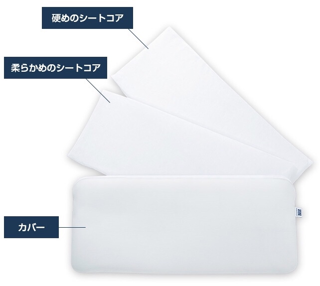 また、中に入っているシートコアを抜き差しして、ピロー全体の高さを自由に調整してお使いいただけます。お使いの寝具の硬さや体型、体格に対応できる構造になっています。