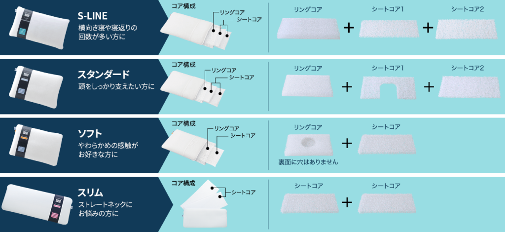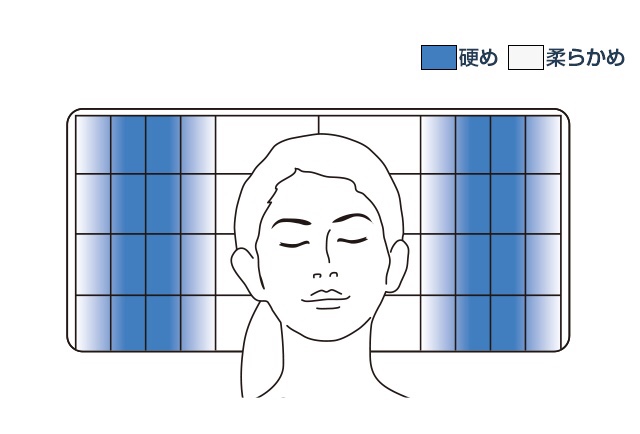 仰向けでも横向き寝でも、理想的な頭の高さをキープするため、ピローの両サイドを中央に比べて硬く調整しました。