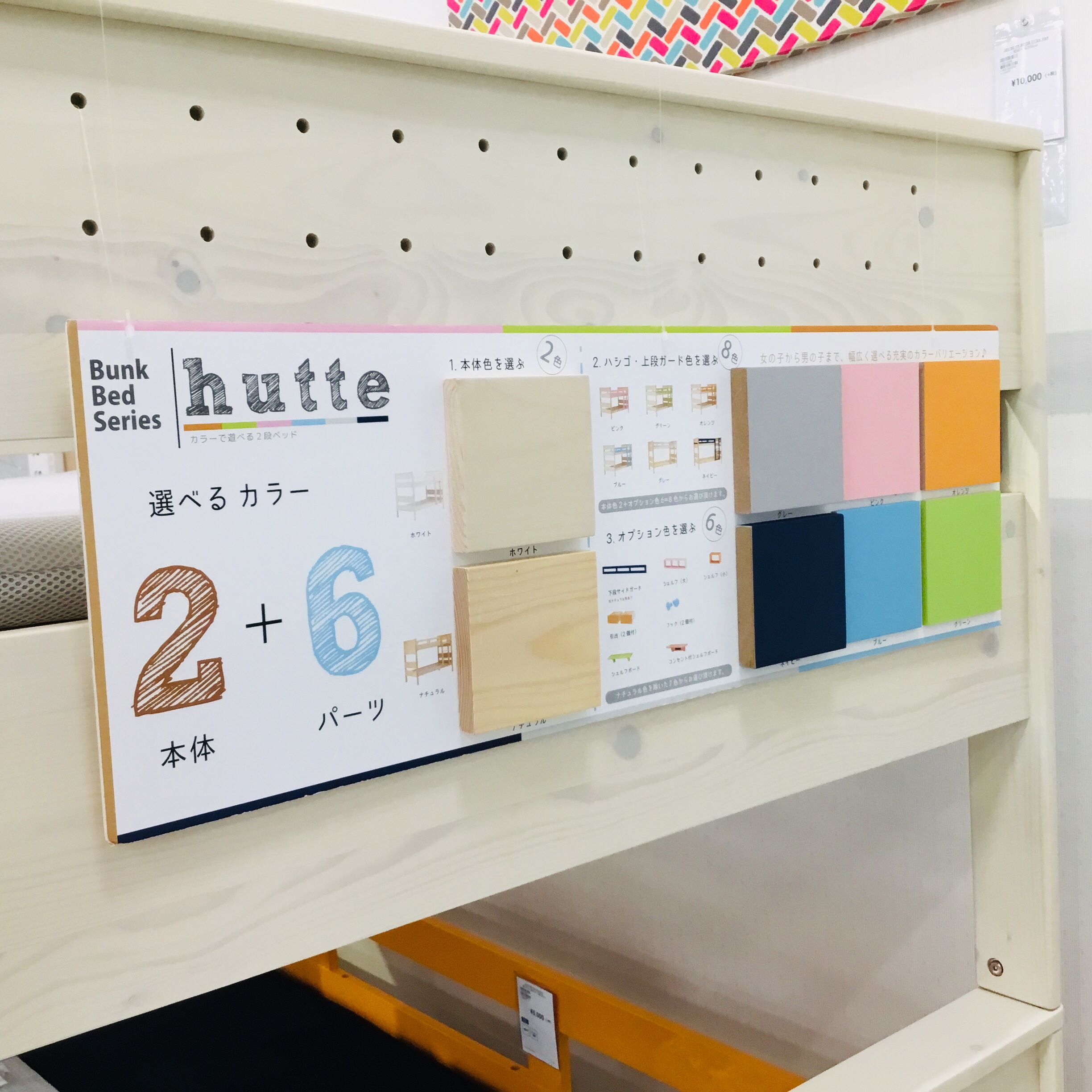 2段ベッド本体はホワイト色とナチュラル色で、オプションパーツ等でそれぞれカラーをお選び頂けるようになっています。