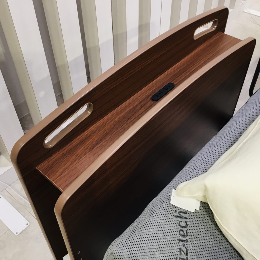 ヘッドボードは2口コンセント付きで、小物が置けるキャビネットタイプ。側面には高さが変えられる可動棚付いているので十分な収納スペースを確保できます。