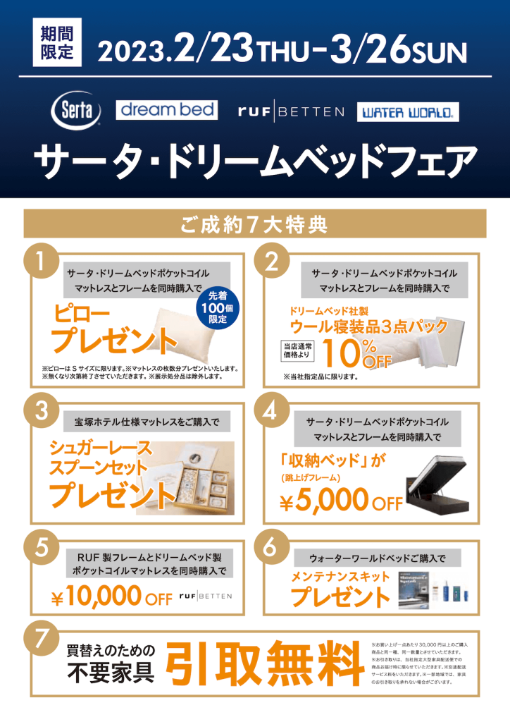 今回は、今 開催中の『サータ・ドリームベッドフェア』の商品の中から、フェア期間限定でお試し&ご覧頂ける商品をご紹介します!