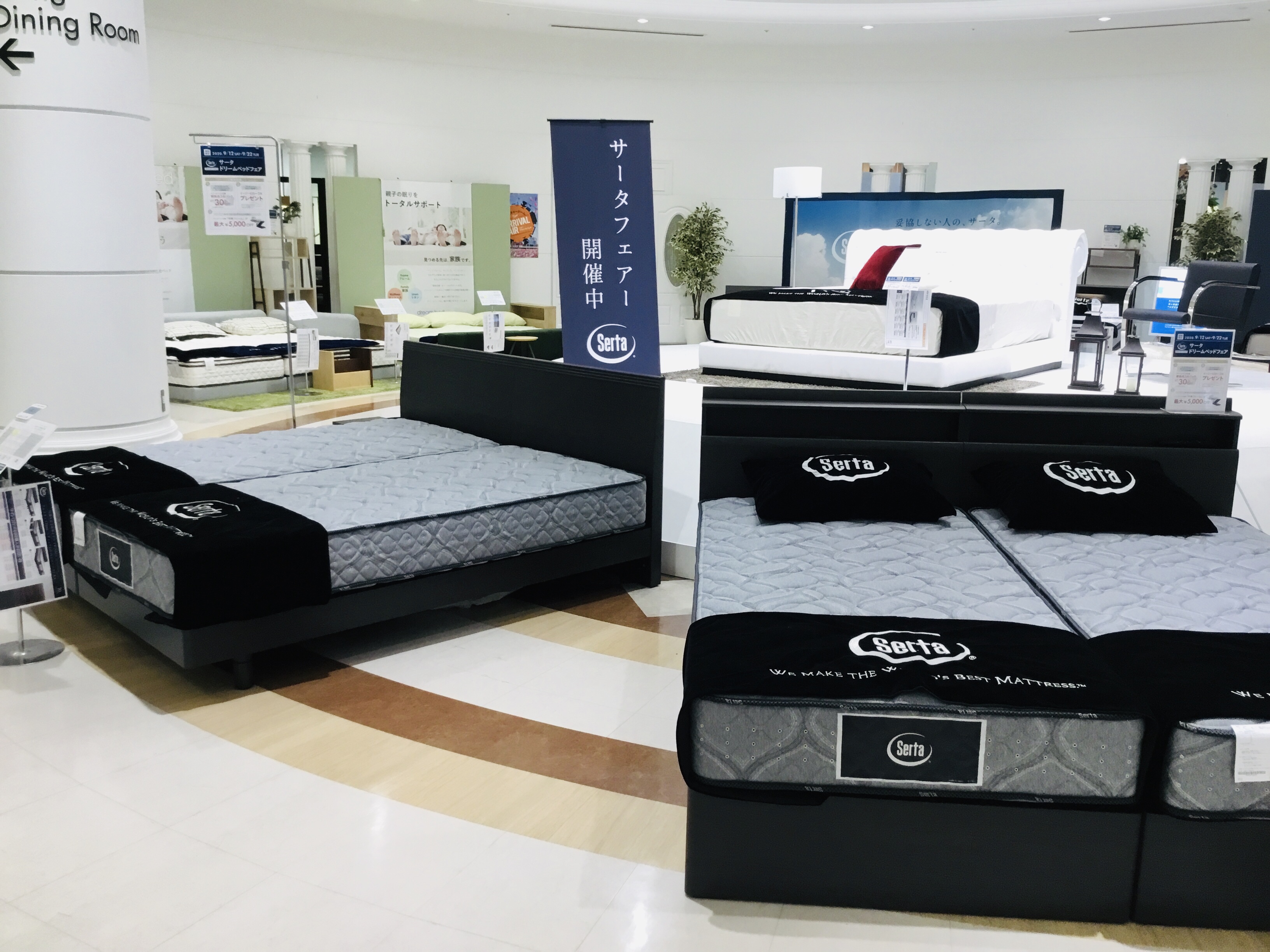 もちろん、エスカレーターを上がって右手方向奥の売場にもサータ・ドリームベッドを含む各メーカーのベッドをご用意しておりますので、ぜひ奥の売場まで足を伸ばしてご覧ください。