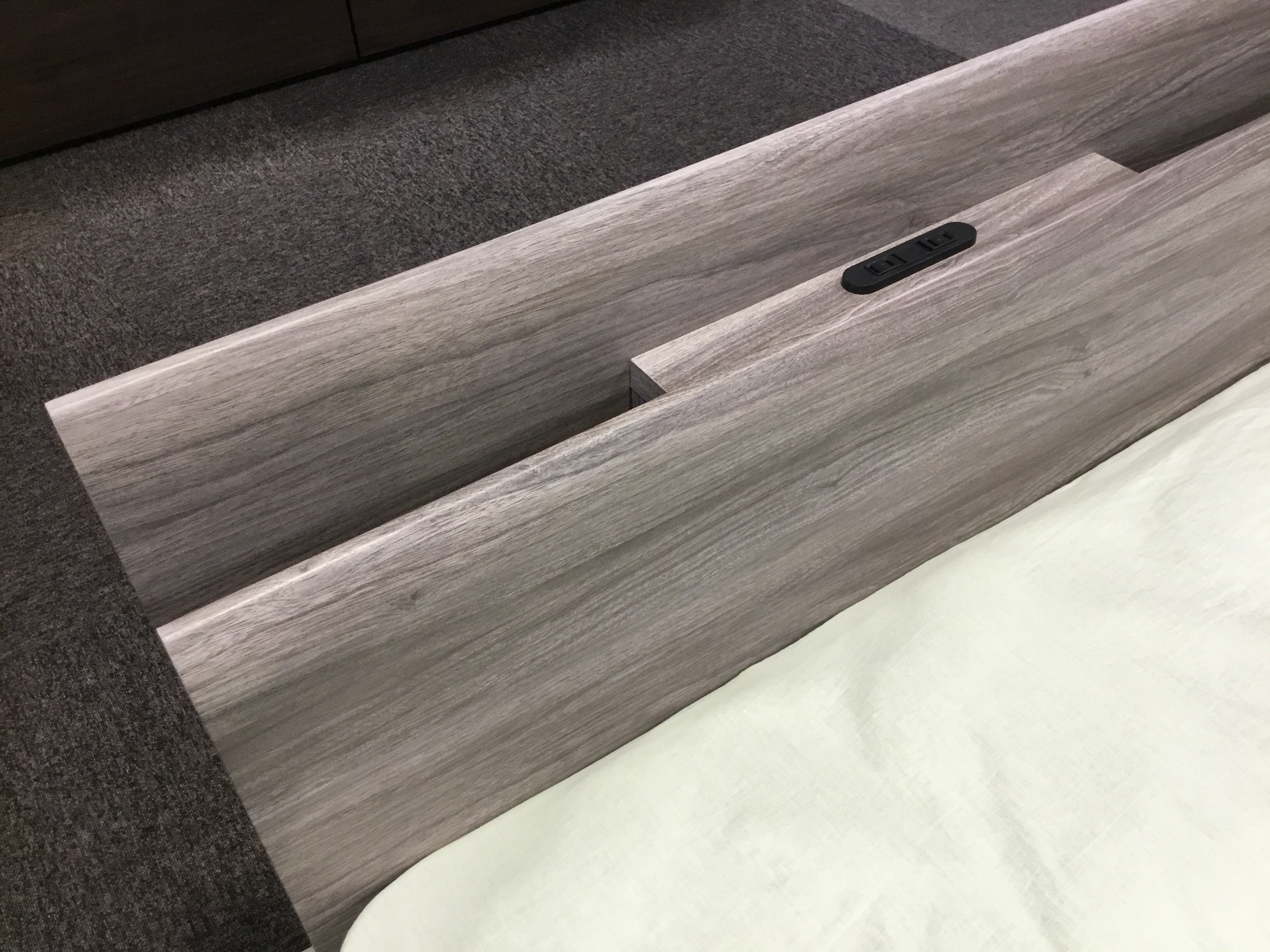 カラーは2色。展示はグレイッシュウォールナット色で、グレー色のウォールナット木目となっております。