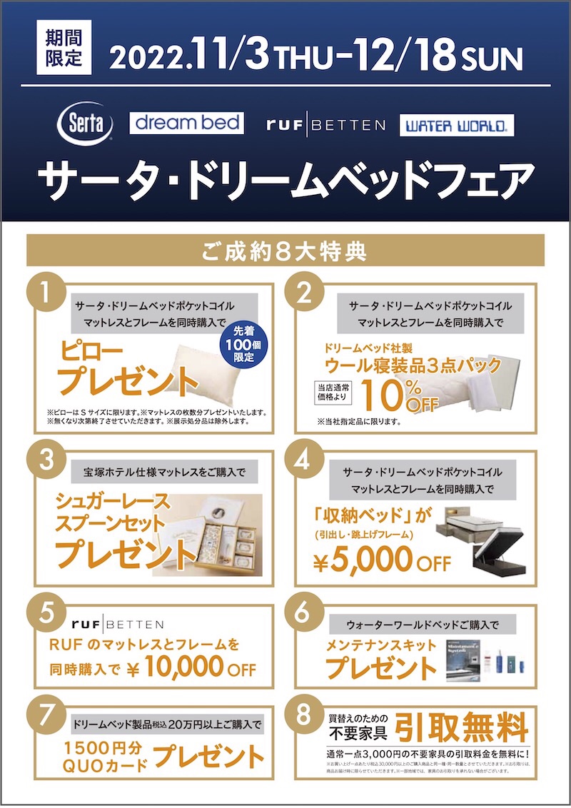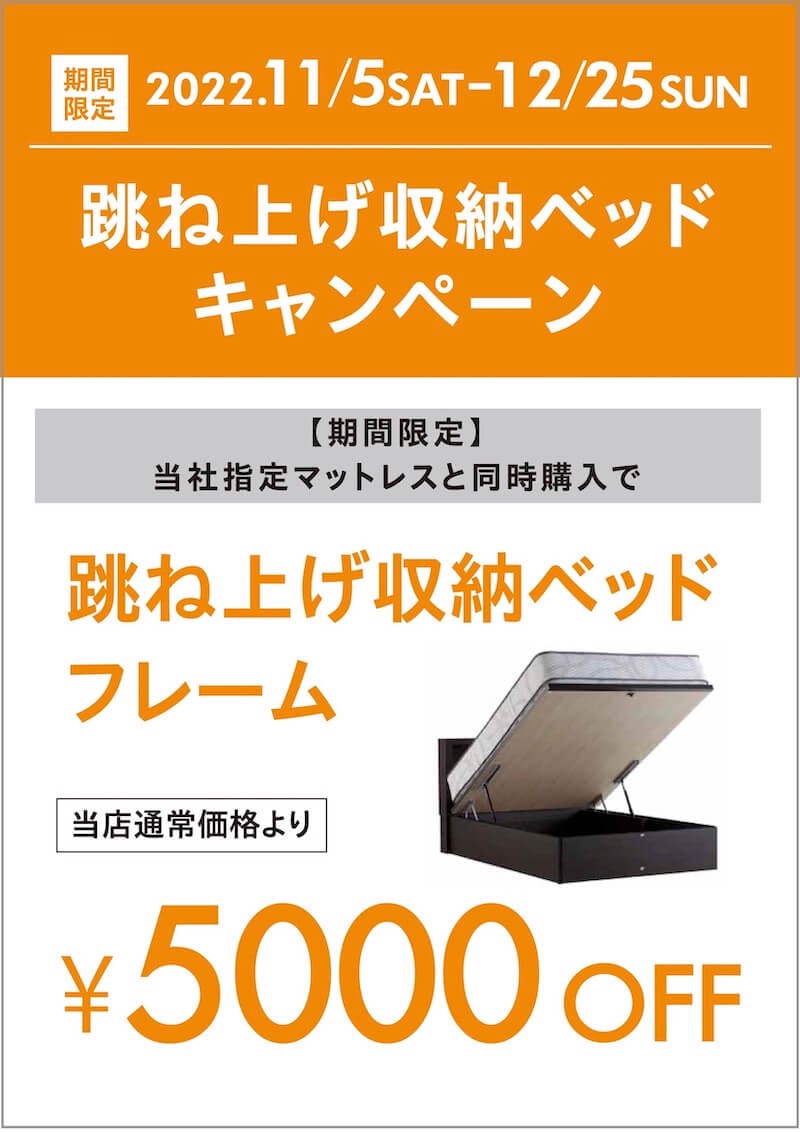 また、12月25日(日)まではドリームベッド以外のメーカーの跳ね上げ収納ベッドも同様に、当社指定のマットレスと同時購入で¥5,000引きとなります!