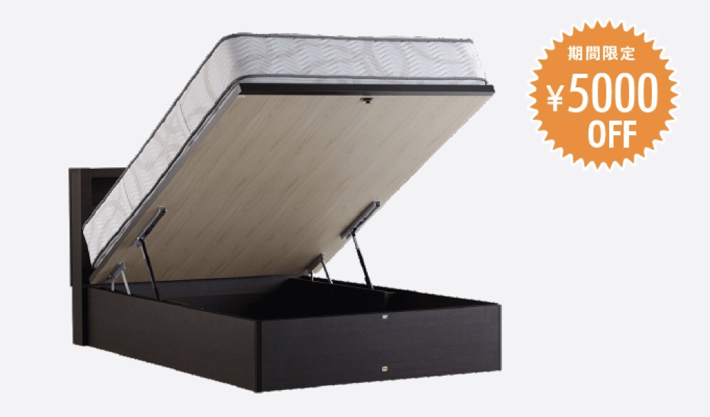 各社の跳ね上げ収納タイプのフレームをご用意しており、当社指定のマットレスと同時購入で¥5,000 OFF!となります。