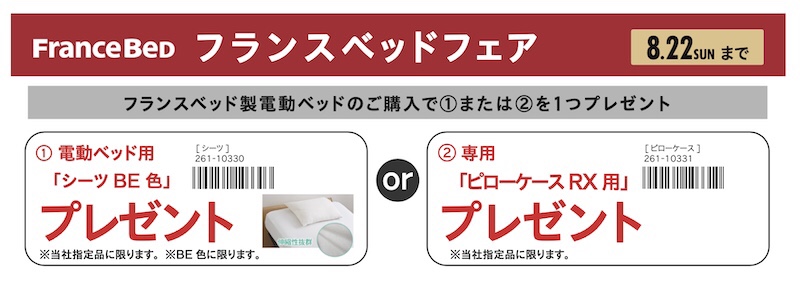 フランスベッドのリクライニングベッドをご購入の方には「専用シーツ」もしくは「専用ピローケース」のいずれかをプレゼント致します!
