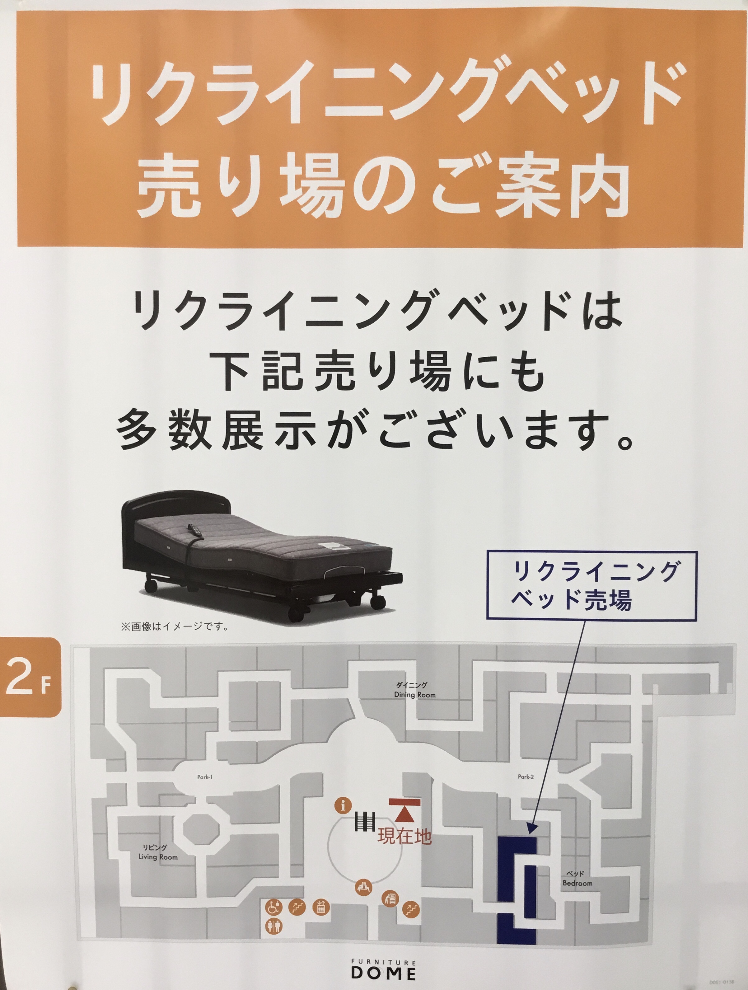 1階正面出入口からエスカレーターで上がって右側に、リクライニングベッドと売場のご案内をしております。